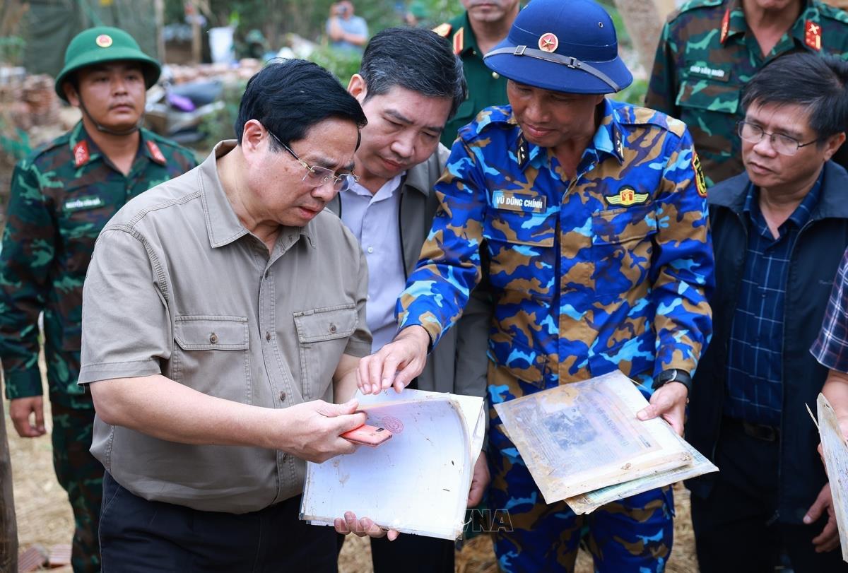 Thủ tướng Phạm Minh Chính thăm, động viên hộ gia đình bị thiệt hại nặng nề do mưa lũ tại thôn Phú Hữu, xã Hòa Thịnh (29/11/2025). Ảnh: Dương Giang-TTXVN