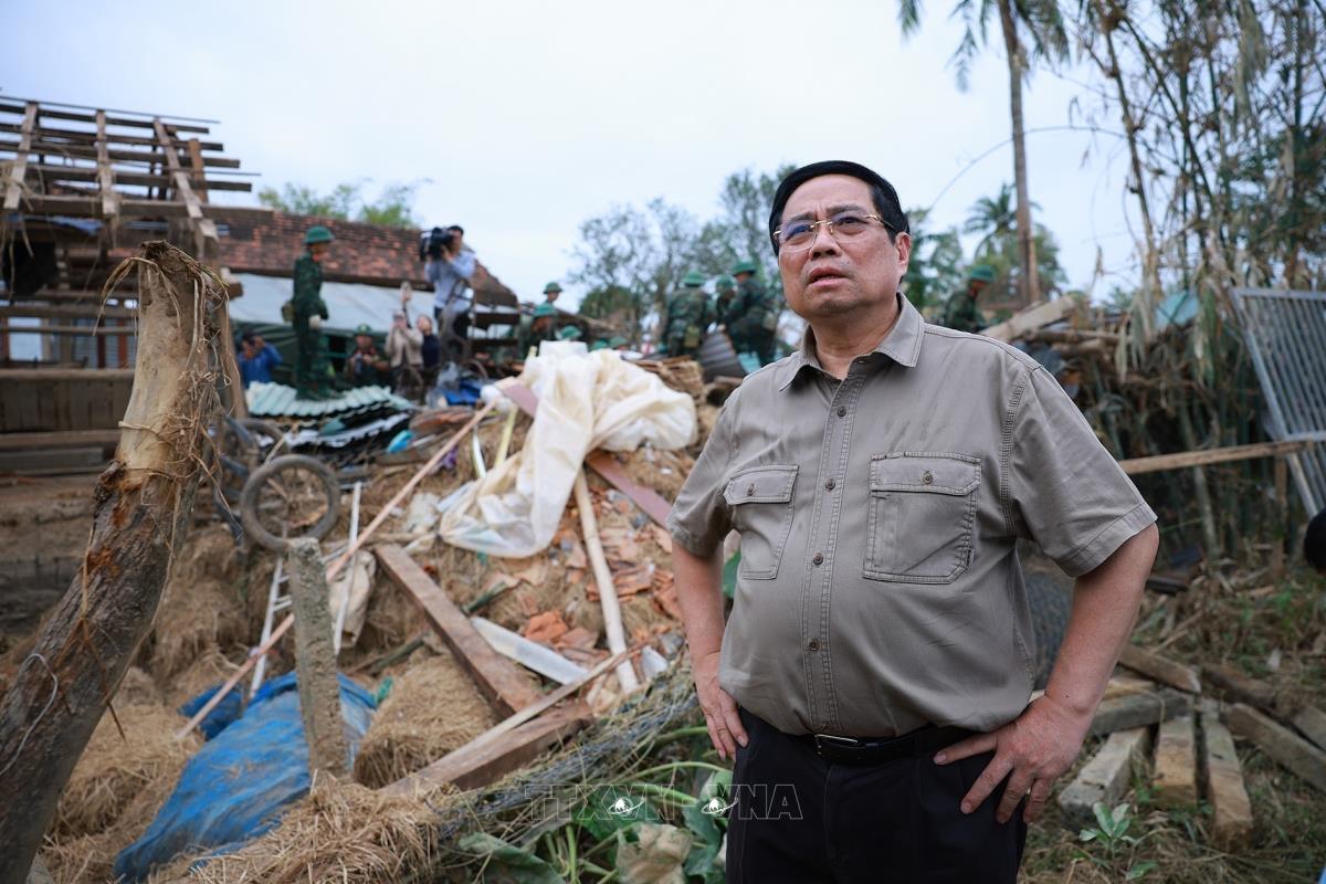 Thủ tướng Phạm Minh Chính thăm hộ gia đình bị sập nhà tại thôn Phú Hữu, xã Hòa Thịnh (29/11/2025). Ảnh: Dương Giang-TTXVN