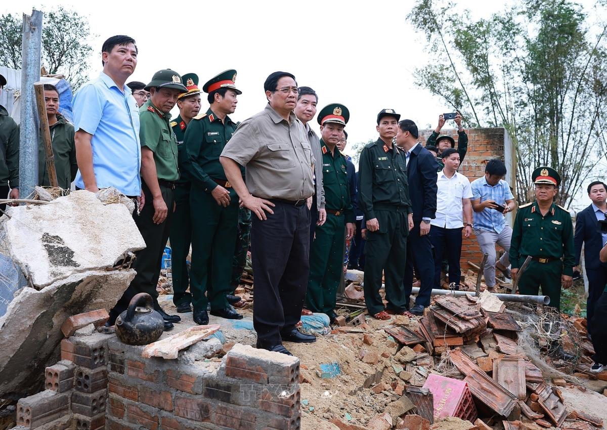 Thủ tướng Phạm Minh Chính thăm, động viên hộ gia đình có nhà bị sập hoàn toàn tại thôn Phú Hữu, xã Hòa Thịnh (29/11/2025). Ảnh: Dương Giang-TTXVN