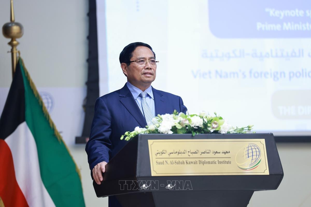 Thủ tướng Phạm Minh Chính phát biểu về chính sách của Việt Nam tại Học viện Ngoại giao Kuwait (18/11/2025). Ảnh: Dương Giang-TTXVN