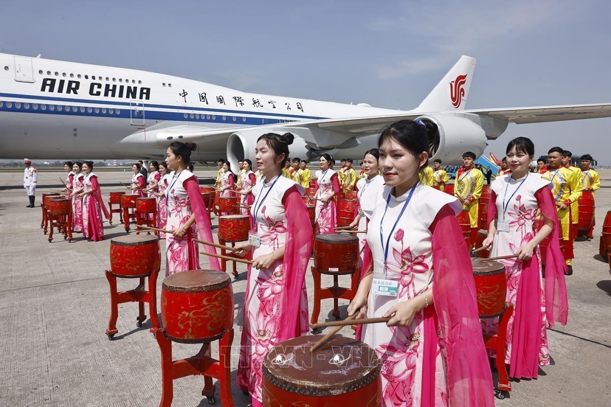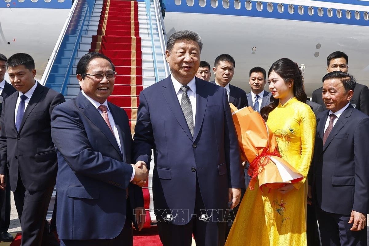 Tại sảnh VIP A, Sân bay quốc tế Nội Bài, trong màn trống hội và tiết mục múa của các thiếu nữ mang trang phục 54 dân tộc Việt Nam, Thủ tướng Chính phủ Phạm Minh Chính chúc mừng Tổng Bí thư, Chủ tịch nước Trung Quốc Tập Cận Bình có chuyến thăm cấp Nhà nước tới Việt Nam rất thành công; khẳng định kết quả chuyến thăm có ý nghĩa chiến lược, tác động lâu dài đến sự phát triển của quan hệ giữa hai Đảng, hai nước, nhất là trong bối cảnh Việt Nam và Trung Quốc đều đang bước vào kỷ nguyên mới, thời đại phát triển mới.