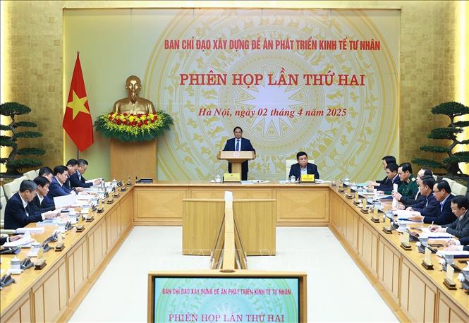 Hà Nội (TTXVN 2/4/2025) Chiều 2/4, chủ trì Phiên họp thứ hai của Ban Chỉ đạo xây dựng Đề án phát triển kinh tế tư nhân, Thủ tướng Chính phủ Phạm Minh Chính, Trưởng Ban Chỉ đạo nhấn mạnh phải tạo bước ngoặt, tin tưởng, hy vọng, tạo động lực, truyền cảm hứng, khuyến khích phát triển kinh tế tư nhân; tạo điều kiện, giao nhiệm vụ để kinh tế tư nhân tham gia các chương trình, dự án lớn của đất nước.
