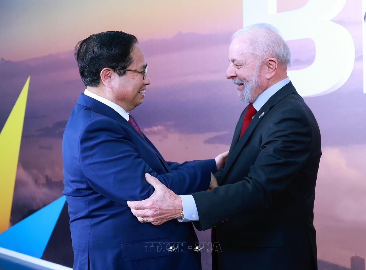 Chiều 6/7/2025 giờ địa phương ( sáng 7/7 giờ Hà Nội), tại thành phố Rio de Janeiro, Tổng thống Cộng hòa Liên bang Brazil Lula da Silva đón Thủ tướng Phạm Minh Chính và các Trưởng đoàn tham dự Hội nghị Thượng đỉnh nhóm các nền kinh tế mới nổi (BRICS) mở rộng năm 2025.