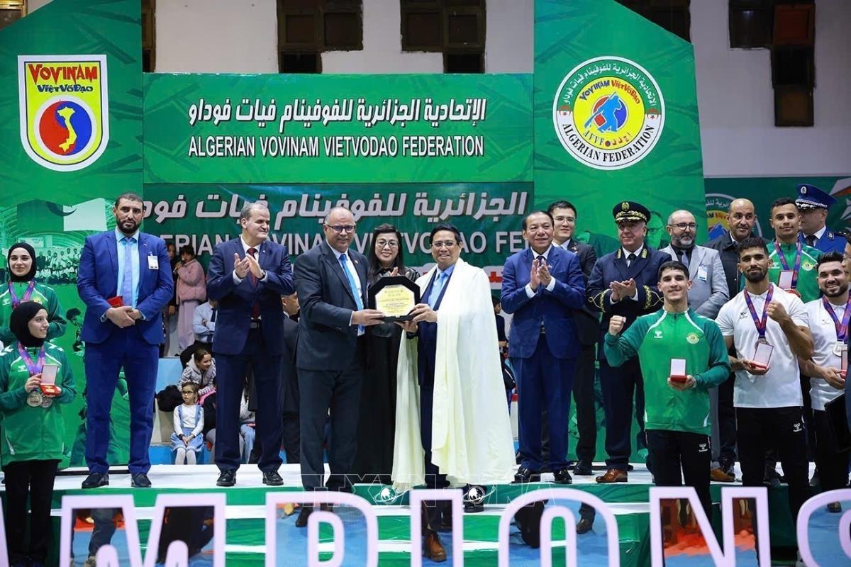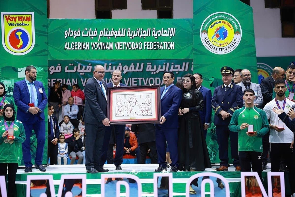 Lãnh đạo Liên đoàn Vovinam tại Algeria tặng quà lưu niệm cho Thủ tướng Phạm Minh Chính (20/11/2025). Ảnh: Dương Giang-TTXVN