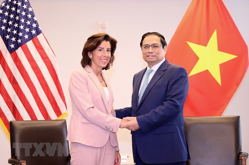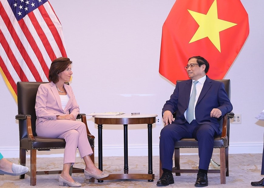 Thủ tướng Phạm Minh Chính tiếp Bộ trưởng Thương mại Hoa Kỳ Gina Raimondo. (Ảnh: Dương Giang/TTXVN)