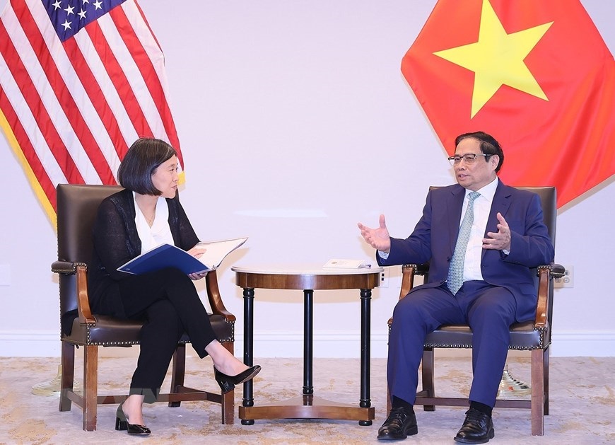 Thủ tướng Phạm Minh Chính tiếp Đại diện Thương mại Hoa Kỳ Katherine Tai. (Ảnh: Dương Giang/TTXVN)
