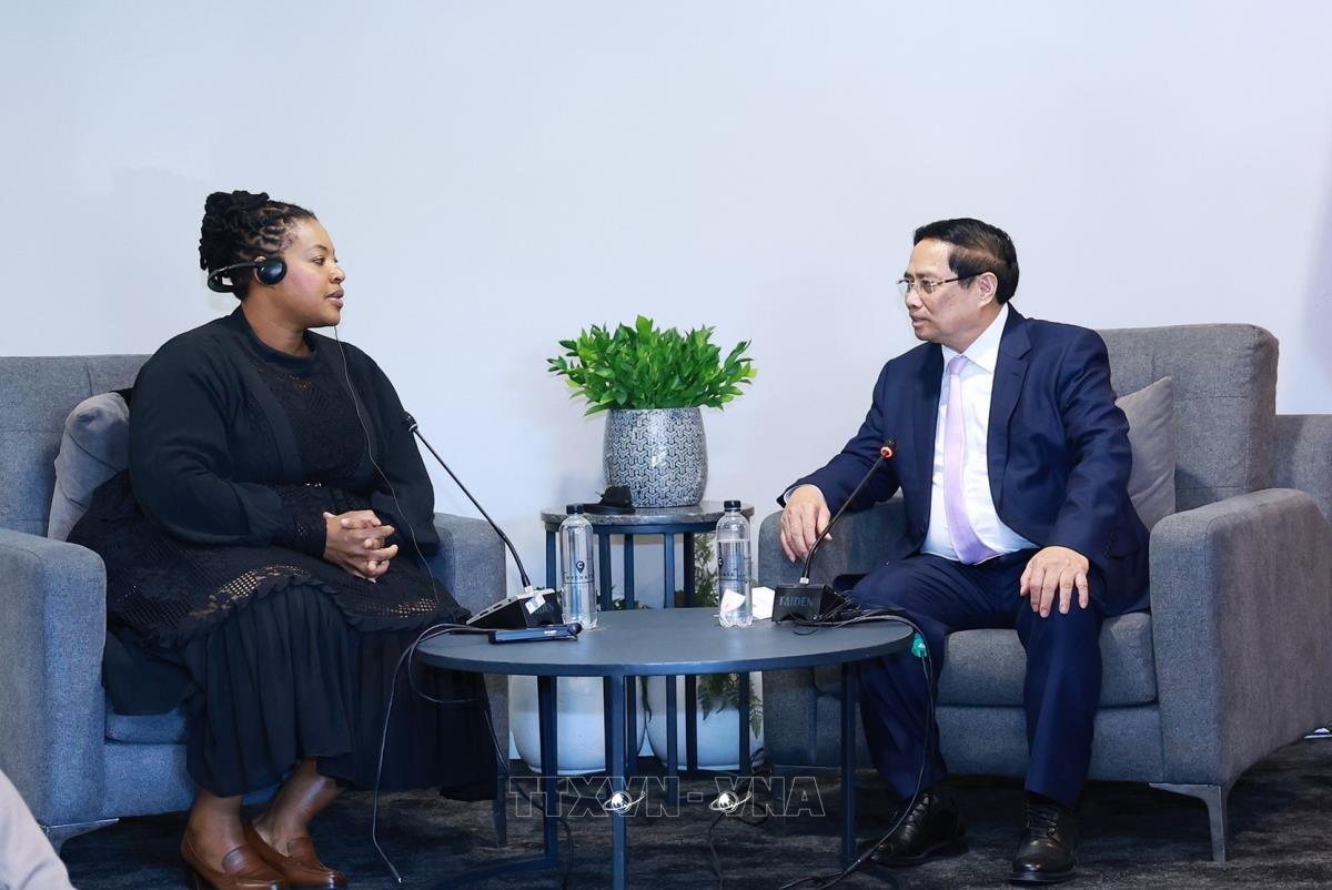 Hà Nội (TTXVN 21/11/2025) Nhân chuyến tham dự Hội nghị Thượng đỉnh G20 tại Nam Phi, sáng 21/11/2025 (giờ địa phương), tại thành phố Johannesburg, Thủ tướng Phạm Minh Chính tiếp bà Sesakho Magadla, Tổng Giám đốc điều hành Công ty Dầu khí Quốc gia Nam Phi.
