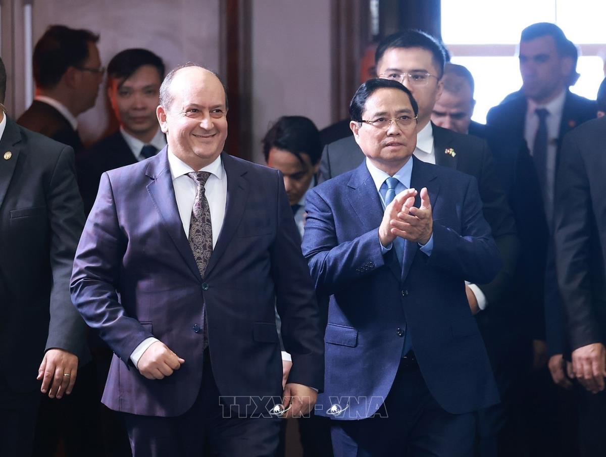Thủ tướng Phạm Minh Chính và Thủ tướng Algeria Sifi Ghrieb tham dự Diễn đàn kinh tế Việt Nam – Algeria (19/11/2025). Ảnh: Dương Giang-TTXVN