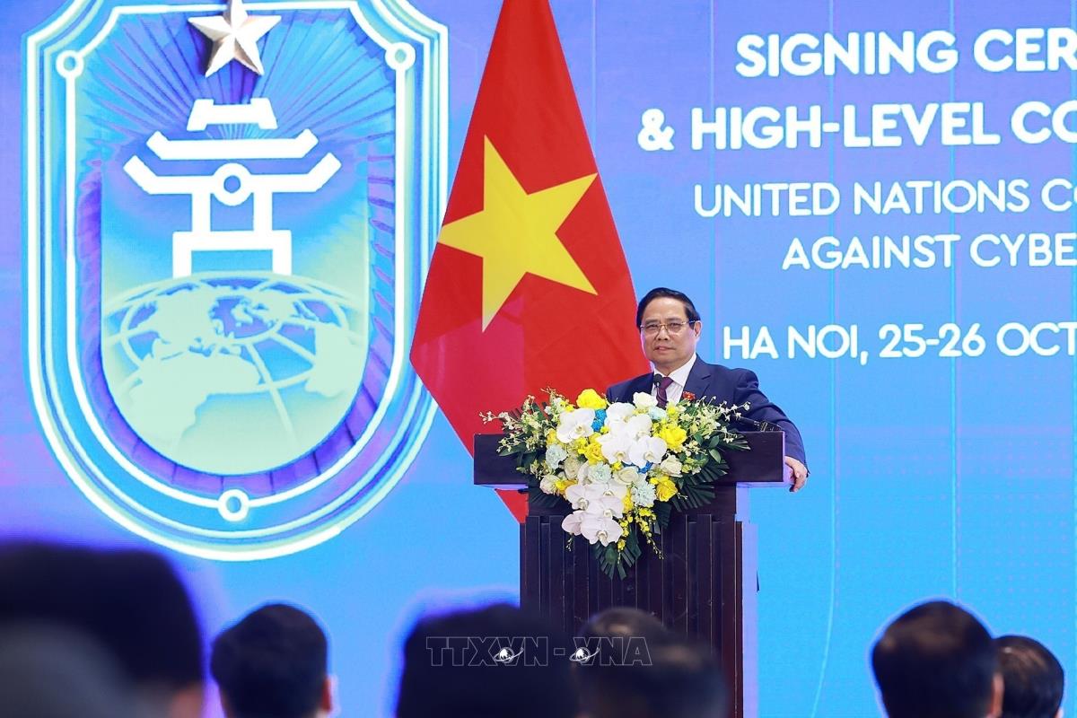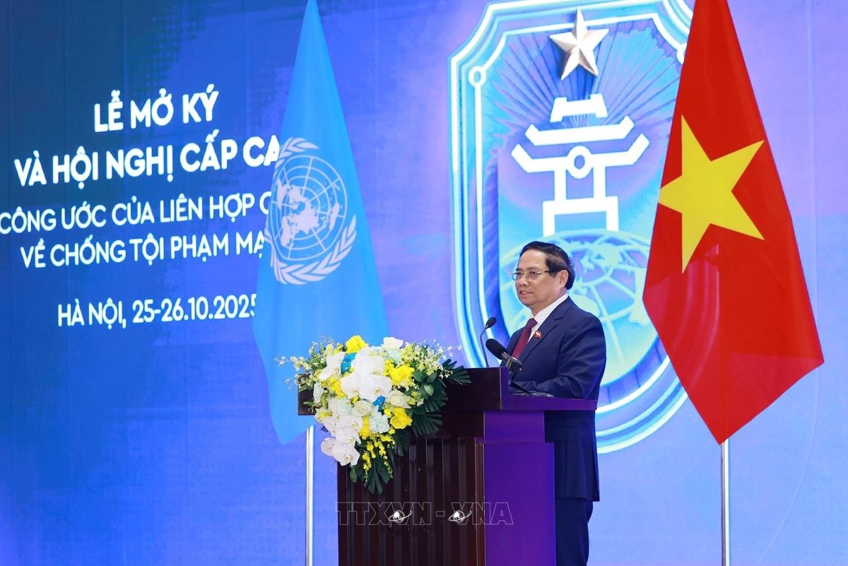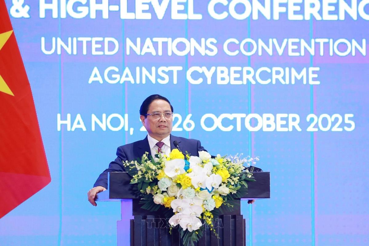 Thủ tướng Phạm Minh Chính phát biểu tại cuộc gặp gỡ báo chí Lễ mở ký và Hội nghị cấp cao Công ước của Liên hợp quốc về chống tội phạm mạng (25/10/2025). Ảnh: Dương Giang-TTXVN