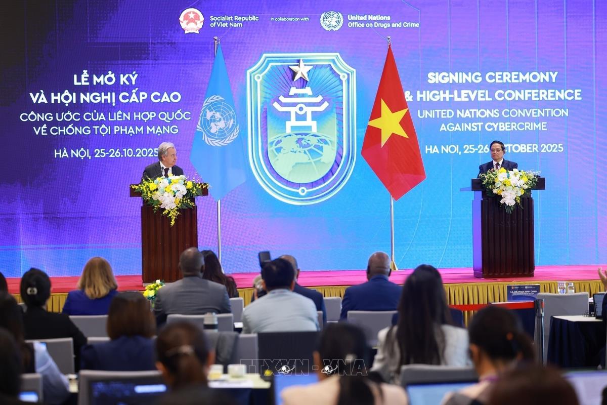 Thủ tướng Chính phủ Phạm Minh Chính cùng Tổng Thư ký Liên hợp quốc António Guterres gặp gỡ báo chí tại Lễ mở ký và Hội nghị cấp cao Công ước của Liên hợp quốc về Chống tội phạm mạng (25/10/2025). Ảnh: Dương Giang-TTXVN