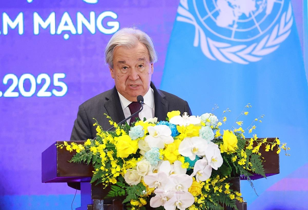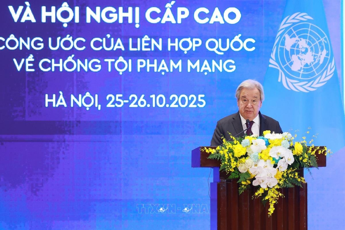 Tổng Thư ký Liên hợp quốc António Guterres gặp gỡ báo chí tại Lễ mở ký và Hội nghị cấp cao Công ước của Liên hợp quốc về Chống tội phạm mạng (25/10/2025). Ảnh: Dương Giang-TTXVN
