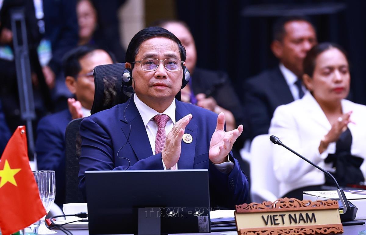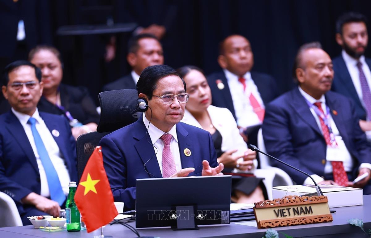 Thủ tướng Phạm Minh Chính tham dự và phát biểu tại Phiên toàn thể Hội nghị Cấp cao ASEAN lần thứ 46 (26/5/2025). Ảnh: Dương Giang-TTXVN