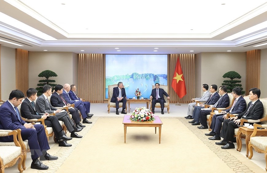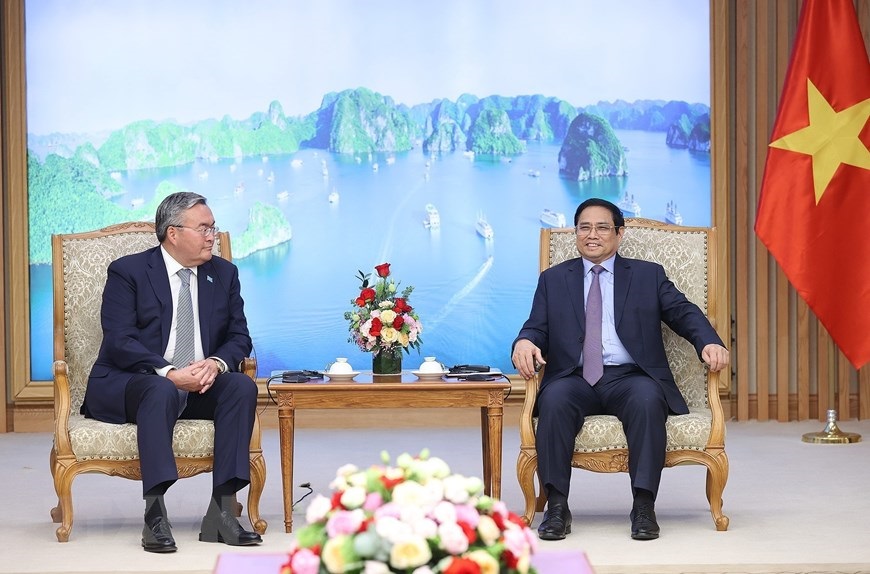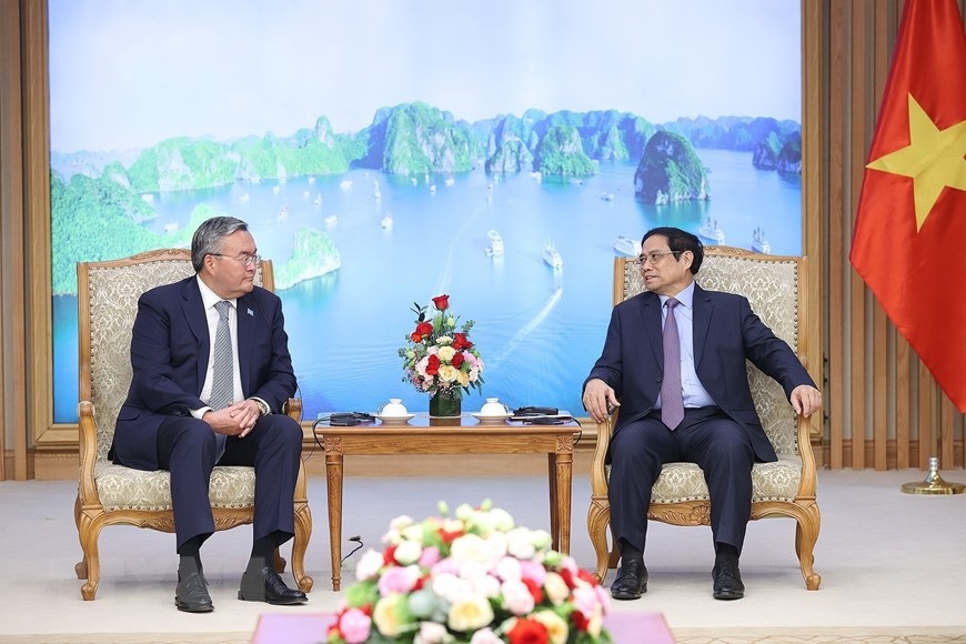 Thủ tướng Phạm Minh Chính tiếp Phó Thủ tướng, Bộ trưởng Ngoại giao Kazakhstan Mukhtar Tileuberdi. (Ảnh: Dương Giang/TTXVN)