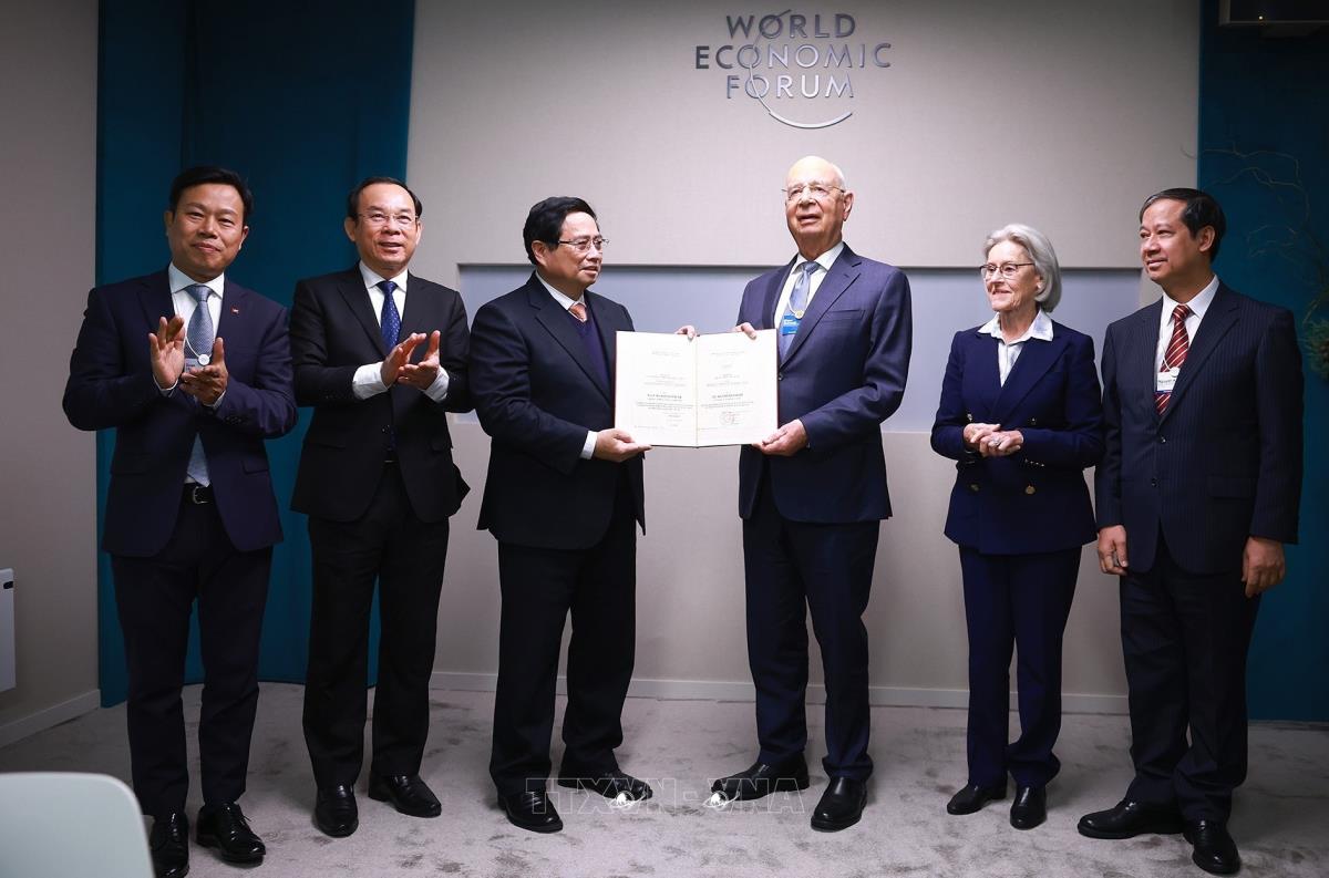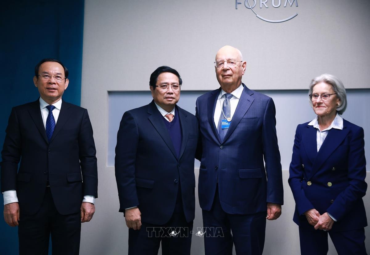 Trong chuyến tham dự Hội nghị thường niên lần thứ 55 Diễn đàn Kinh tế thế giới (WEF) tại Davos (Thụy Sĩ), sáng 22/1/2025, giờ địa phương (chiều cùng ngày, giờ Hà Nội), Thủ tướng Phạm Minh Chính gặp và trao bằng Tiến sĩ danh dự cho Giáo sư Klaus Schwab, Nhà sáng lập kiêm Chủ tịch WEF.
