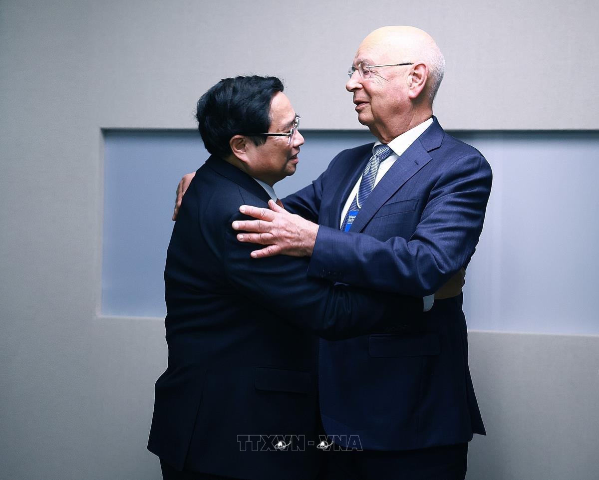 Thủ tướng Phạm Minh Chính với Giáo sư Klaus Schwab, Nhà sáng lập kiêm Chủ tịch WEF (22/1/2025). Ảnh: Dương Giang-TTXVN