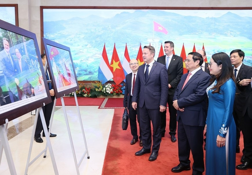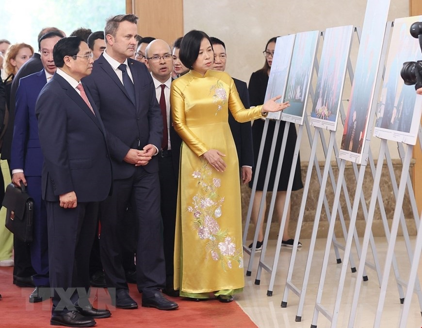 Thủ tướng Phạm Minh Chính và Thủ tướng Đại Công quốc Luxembourg Xavier Bettel tham quan Trưng bày ảnh của Thông tấn xã Việt Nam về hợp tác giữa Việt Nam-Luxembourg. (Ảnh: Dương Giang/TTXVN)