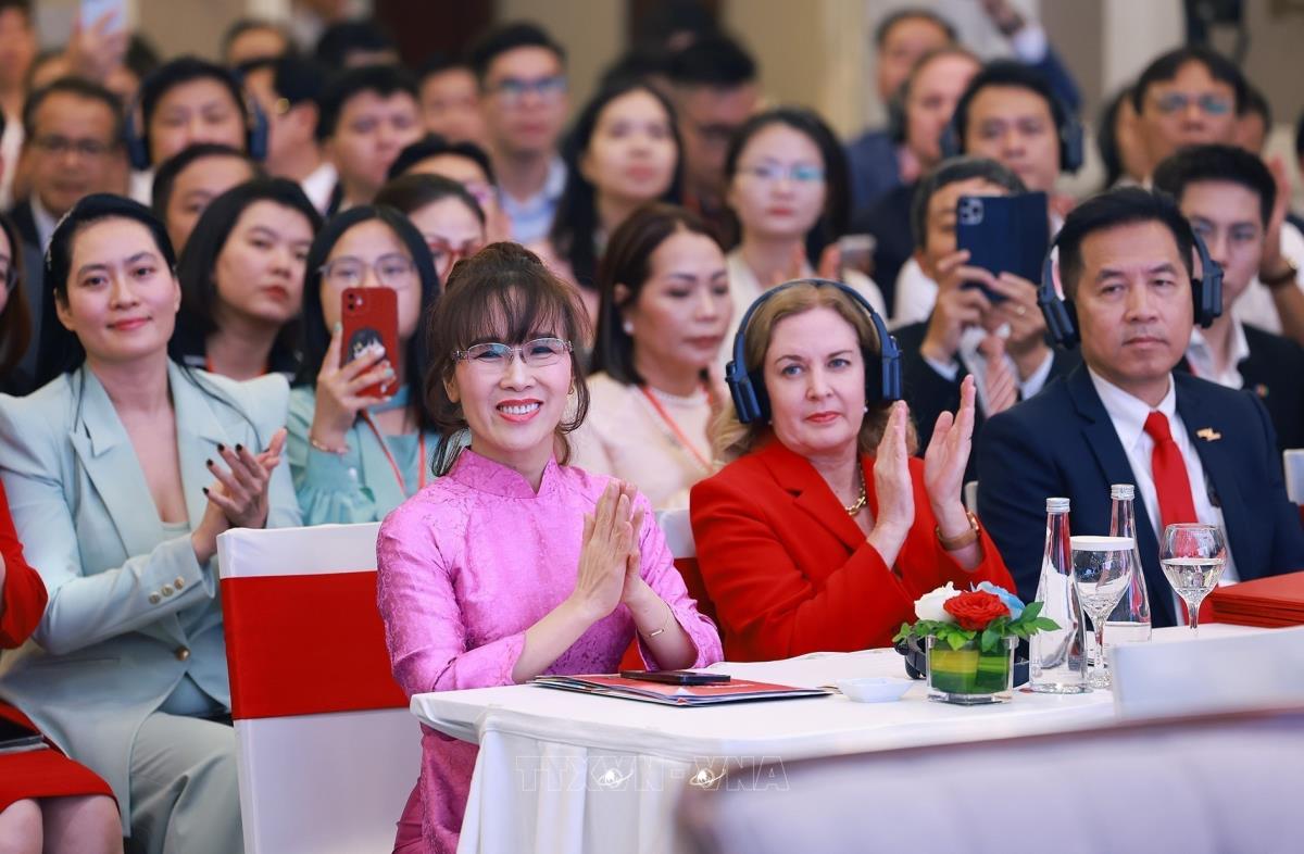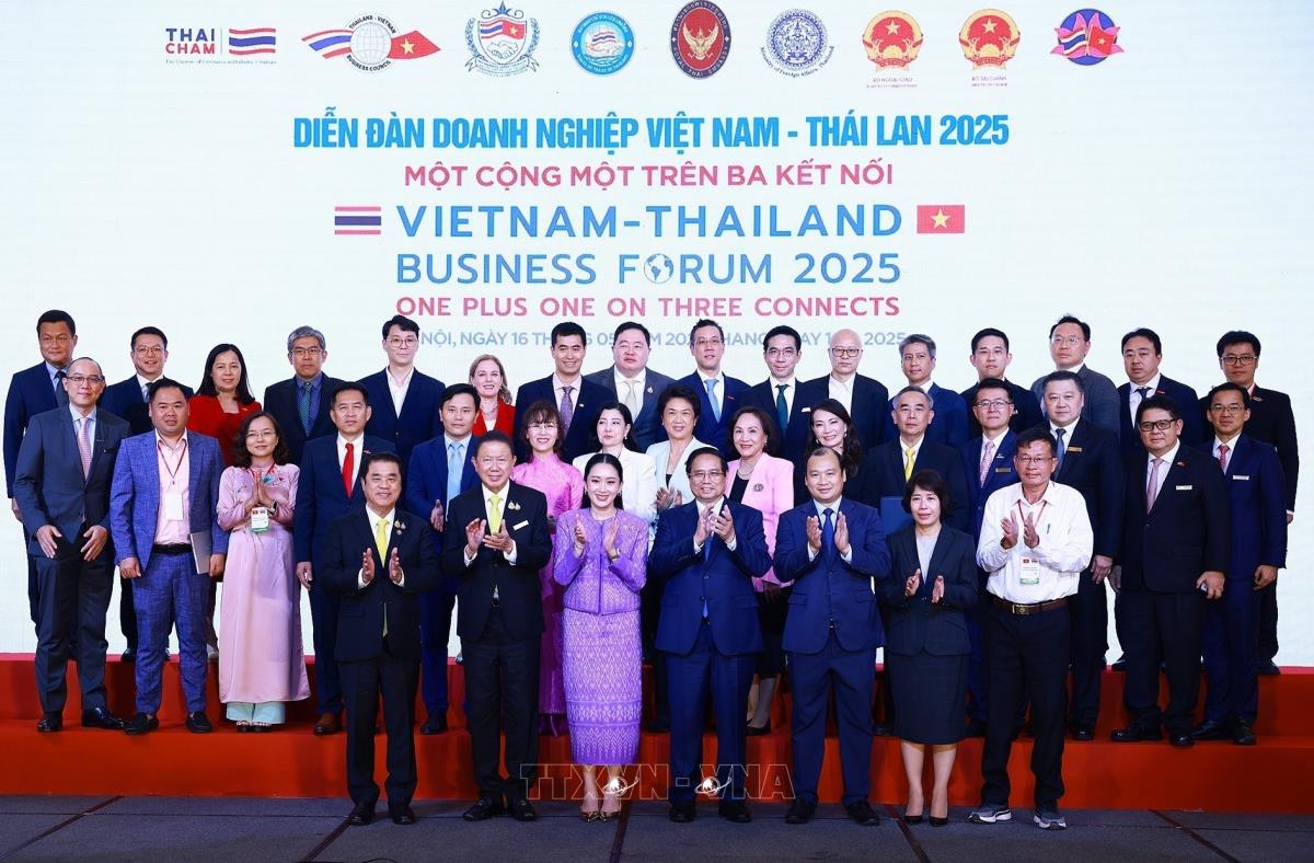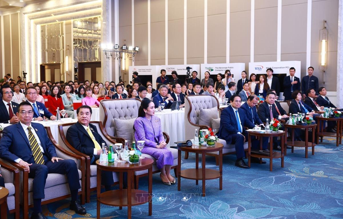 Thủ tướng Phạm Minh Chính và Thủ tướng Vương quốc Thái Lan Lan Paetongtarn Shinawatra với doanh nghiệp hai nước (16/5/2025). Ảnh: Dương Giang-TTXVN