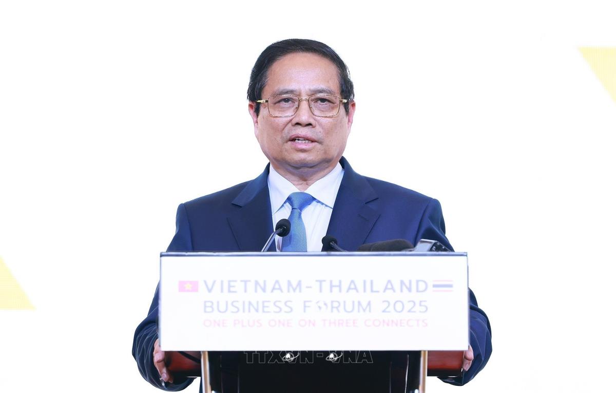 Thủ tướng Phạm Minh Chính phát biểu tại Diễn đàn doanh nghiệp Việt Nam-Thái Lan năm 2025 (16/5/2025). Ảnh: Dương Giang-TTXVN