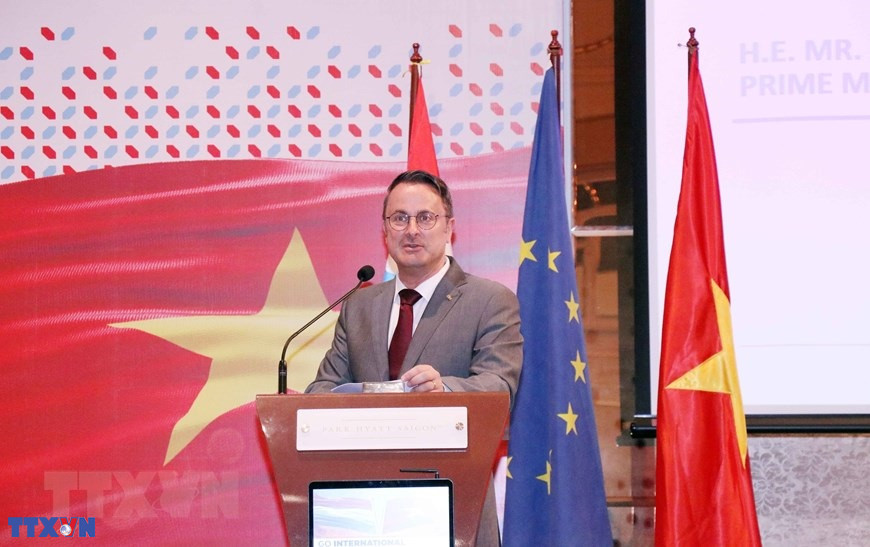 Thủ tướng Đại Công quốc Luxembourg Xavier Bettel phát biểu tại Diễn đàn Doanh nghiệp Việt Nam- Luxembourg. (Ảnh: Xuân Khu/TTXVN)