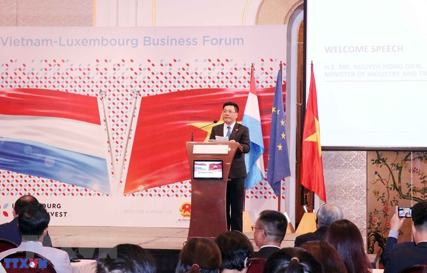 Ông Nguyễn Hồng Diên, Bộ trưởng Bộ Công thương phát biểu tại Diễn đàn Doanh nghiệp Việt Nam- Luxembourg. (Ảnh: Xuân Khu/TTXVN)