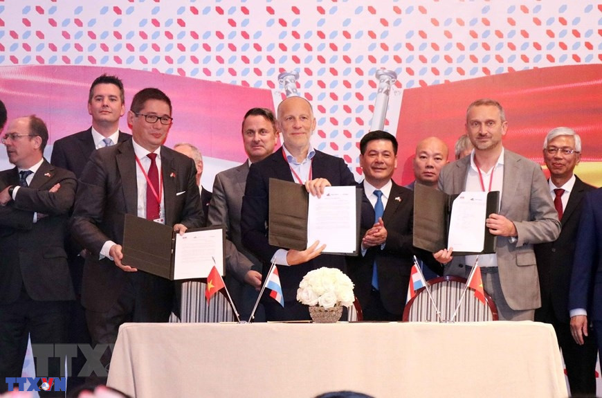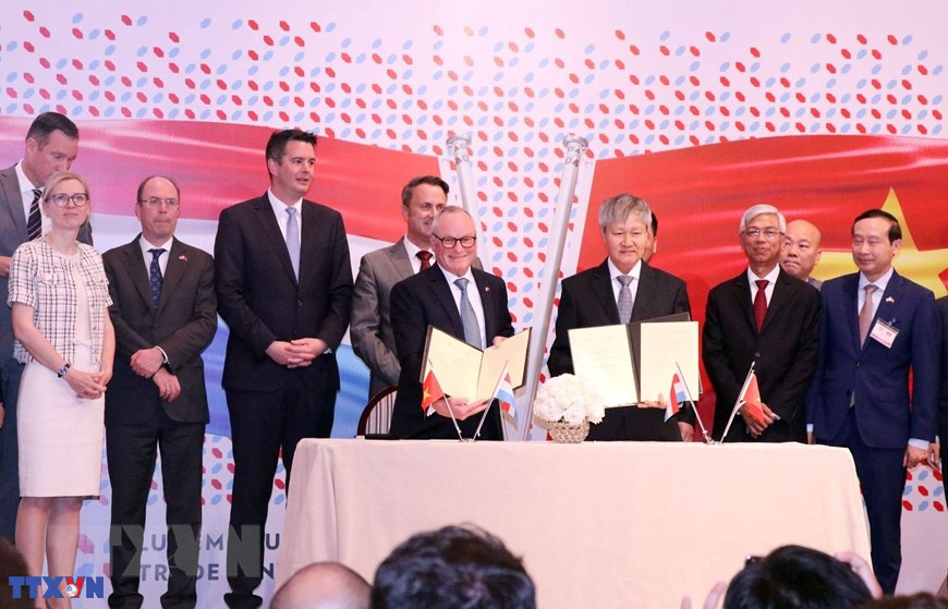 Lễ ký Biên bản ghi nhớ hợp tác giữa các doanh nghiệp Việt Nam và doanh nghiệp Luxembourg. (Ảnh: Xuân Khu/TTXVN)
