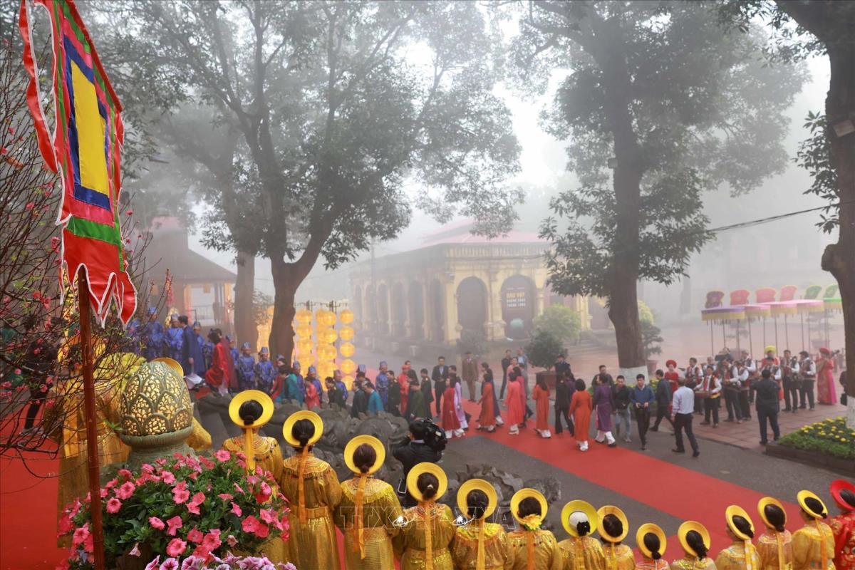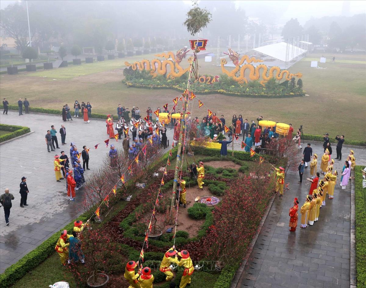 Nghi thức dựng cây Nêu ngày Tết tại Khu di tích Hoàng thành Thăng Long (2/2/2024). Ảnh: Nhật Anh - TTXVN