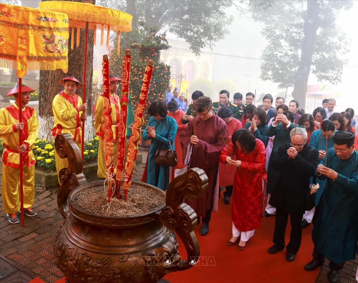 Du khách quốc tế cùng trải nghiệm nghi thức dựng cây Nêu ngày Tết (2/2/2024). Ảnh: Nhật Anh - TTXVN