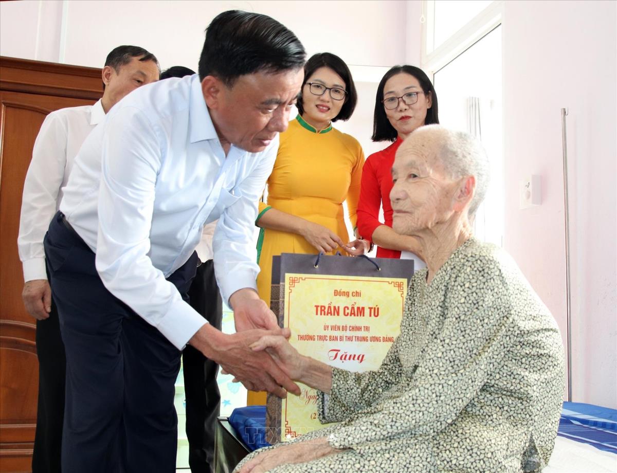 Thường trực Ban Bí thư Trần Cẩm Tú thăm, tặng quà cho các cụ đang điều dưỡng tại Trung tâm Phụng dưỡng người có công cách mạng thành phố Đà Nẵng (cơ sở 2) (21/7/2025). Ảnh: Quốc Dũng - TTXVN