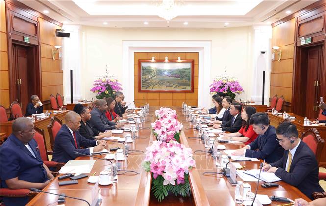 Hà Nội (TTXVN 28/4/2025) Chiều 28/4, tại Trụ sở Trung ương Đảng, Ủy viên Bộ Chính trị, Thường trực Ban Bí thư Trần Cẩm Tú đã hội đàm với Tổng Thư ký Đảng Mặt trận giải phóng Mozambique (FRELIMO) Chakil Aboobacar trong khuôn khổ chuyến thăm làm việc tại Việt Nam và tham dự Lễ kỷ niệm 50 năm Ngày Giải phóng miền Nam, thống nhất đất nước, từ ngày 26/4 - 1/5/2025.