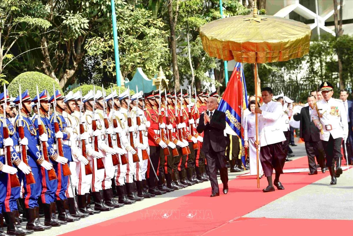 Quốc vương Campuchia Norodom Sihamoni đến tham dự phiên khai mạc kỳ họp đầu tiên Thượng viện Campuchia khóa V. Ảnh: AKP/TTXVN phát