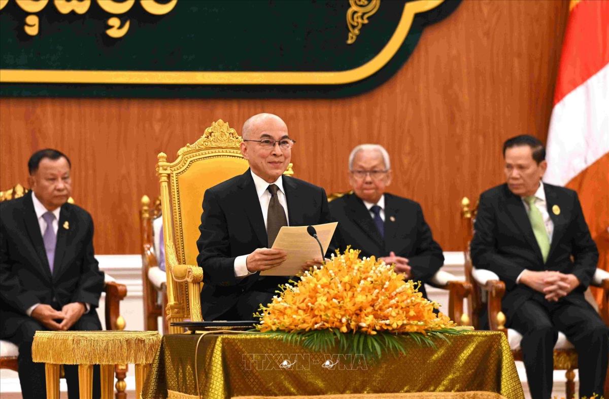Quốc vương Campuchia Norodom Sihamoni đọc thông điệp hoàng gia tại phiên khai mạc kỳ họp đầu tiên Thượng viện Campuchia khóa V. Ảnh: AKP/TTXVN phát