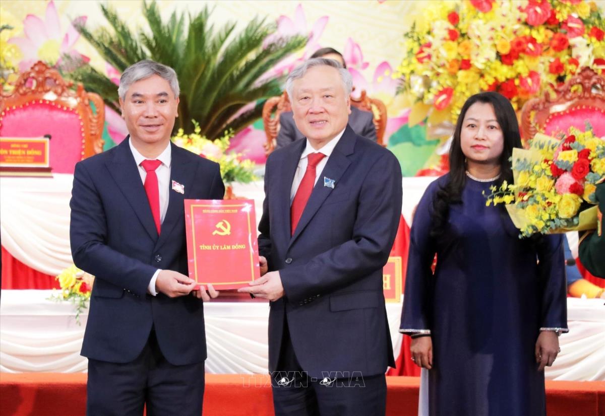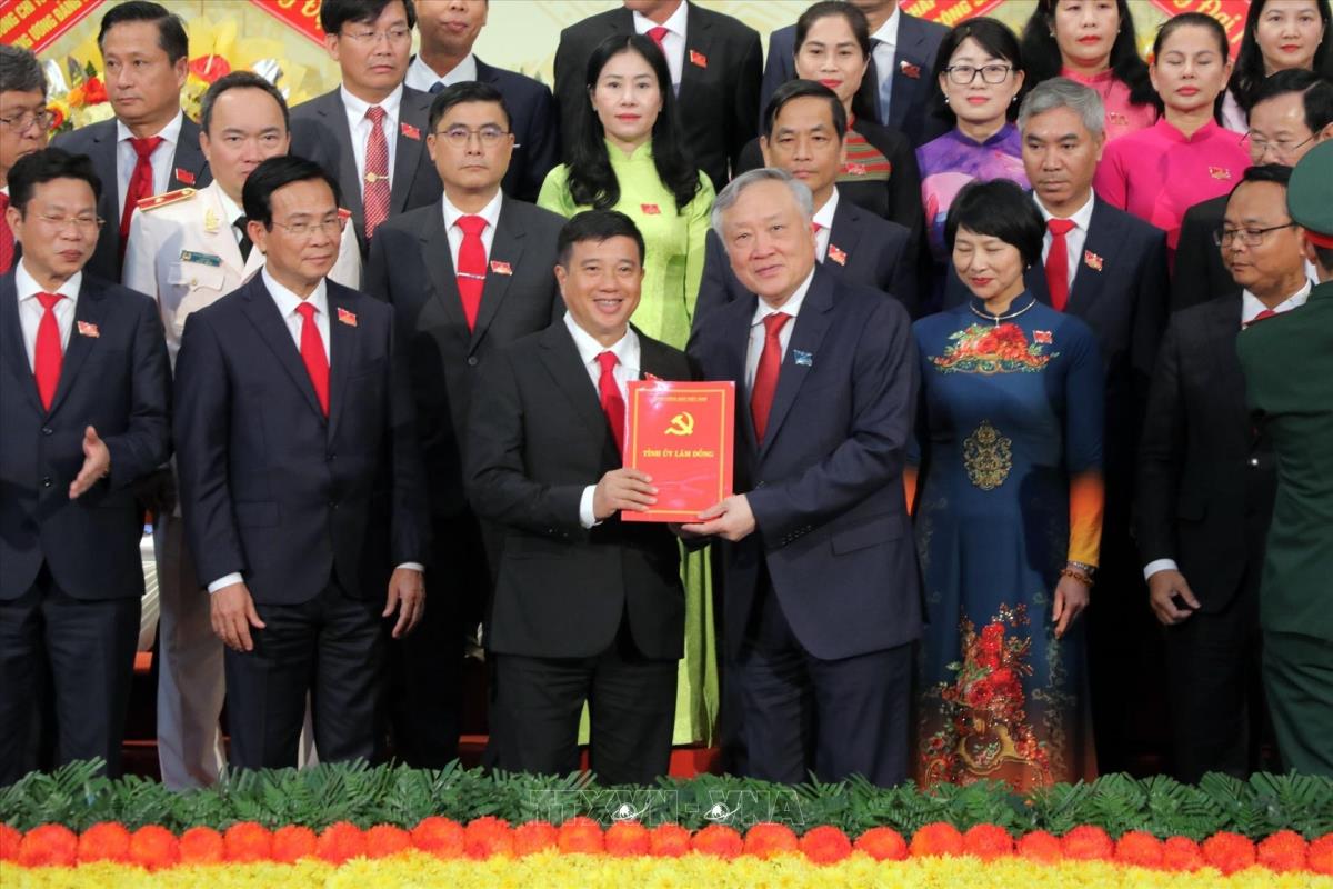 Đồng chí Nguyễn Hòa Bình trao Quyết định của Bộ Chính trị chỉ định Ban Chấp hành, Ban Thường vụ Đảng bộ tỉnh Lâm Đồng (10/10/2025). Ảnh: Chu Quốc Hùng - TTXVN