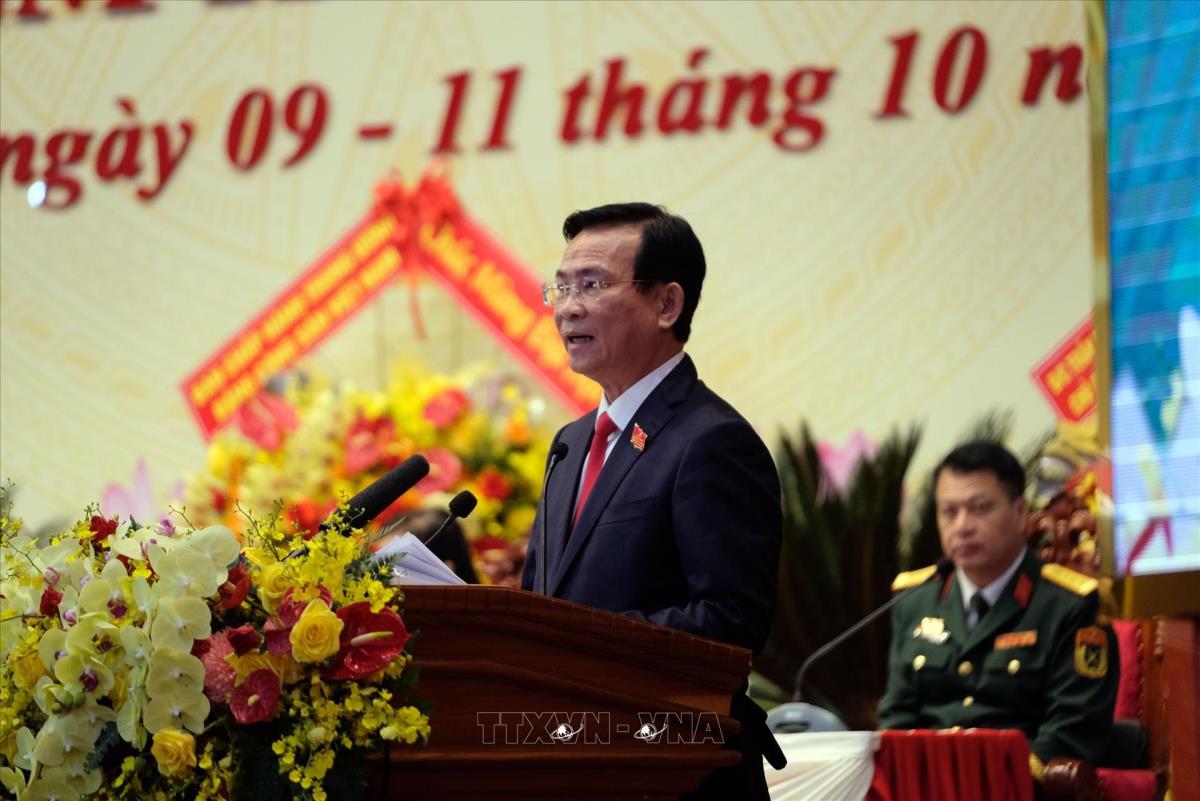 Phó Bí thư Tỉnh ủy, Chủ tịch UBND tỉnh Lâm Đồng Hồ Văn Mười trình bày Dự thảo Báo cáo Chính trị trình Đại hội (10/10/2025). Ảnh: Chu Quốc Hùng - TTXVN