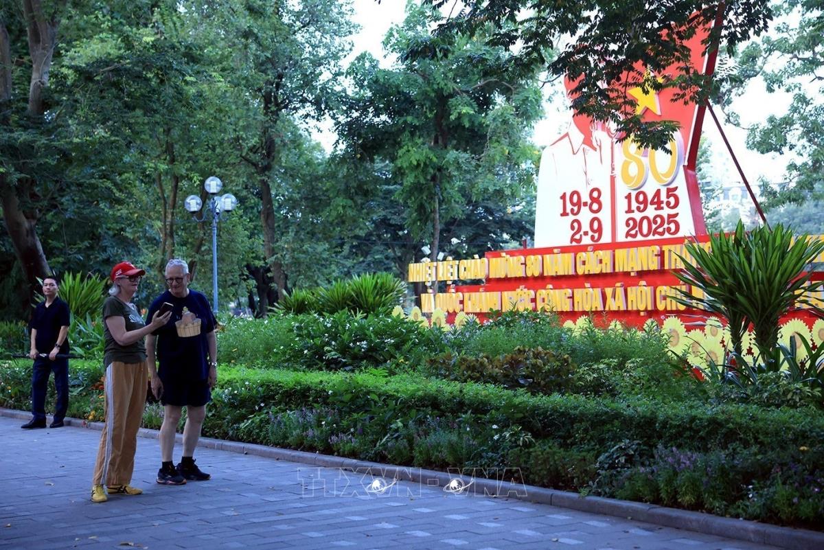 Toàn quyền Australia Sam Mostyn và Phu quân thong thả tản bộ, ngắm cảnh Hà Nội trong buổi sáng mùa Thu (11/9/2025). Ảnh: Tuấn Anh - TTXVN