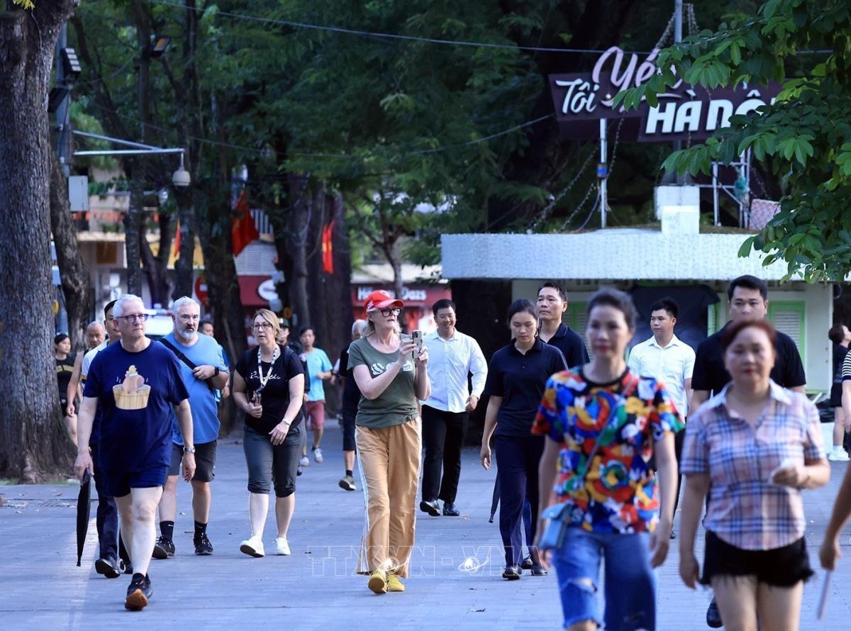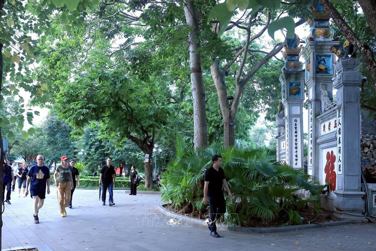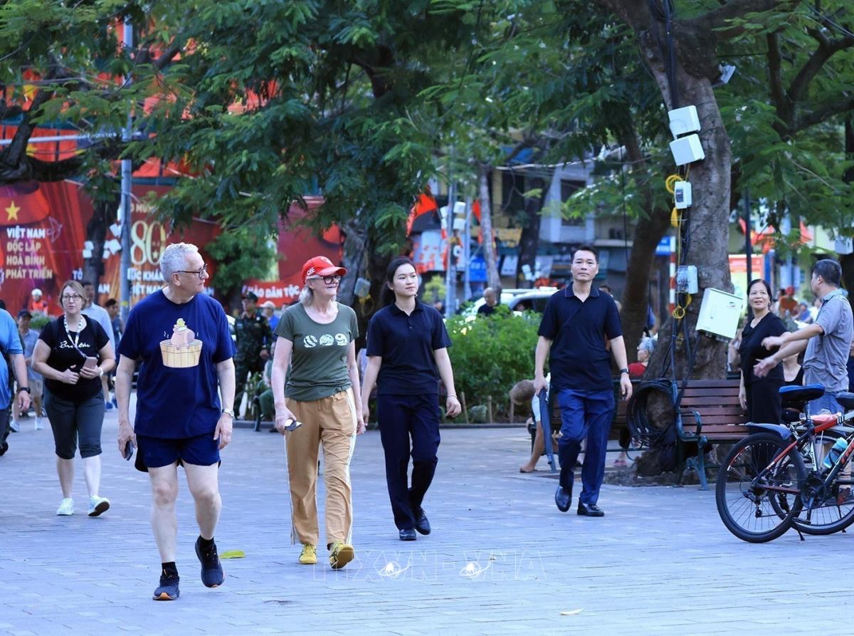Toàn quyền Australia Sam Mostyn và Phu quân thong dong tản bộ quanh hồ Hoàn Kiếm để ngắm cảnh và thưởng ngoạn không khí bình yên của Thủ đô Hà Nội trong tiết trời mùa Thu mát mẻ (11/9/2025). Ảnh: Tuấn Anh - TTXVN