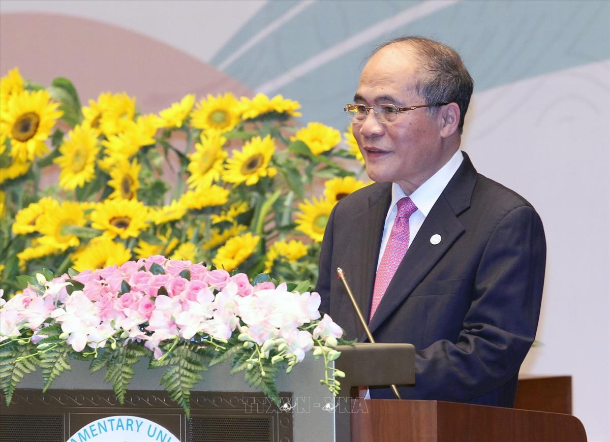Hôm nay, Quốc hội Việt Nam rất vui mừng được đón các vị tại Tòa nhà Quốc hội mới, liền kề với khu di tích Hoàng thành Thăng Long có hàng nghìn năm lịch sử và nhìn ra Quảng trường Ba Đình, nơi Chủ tịch Hồ Chí Minh đã đọc bản Tuyên ngôn lịch sử cách đây đúng 70 năm vào tháng 9 năm 1945, tuyên bố với thế giới một nước Việt Nam độc lập đã ra đời. Với tư tưởng yêu chuộng hòa bình, độc lập dân tộc, hội nhập quốc tế và ý thức được vai trò của IPU, ngay từ sau khi lập lại hòa bình ở Đông Dương (1954), Chủ tịch Hồ Chí Minh và Quốc hội Việt Nam đã đề xuất gia nhập IPU.