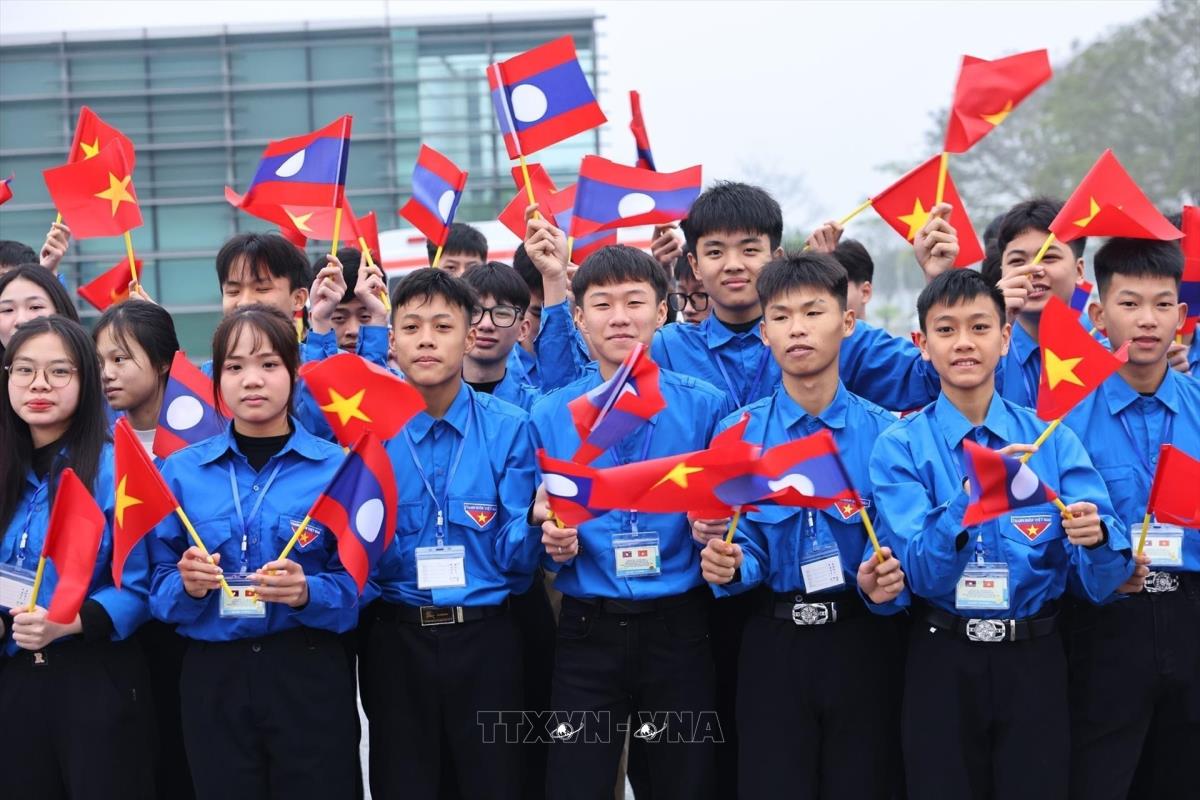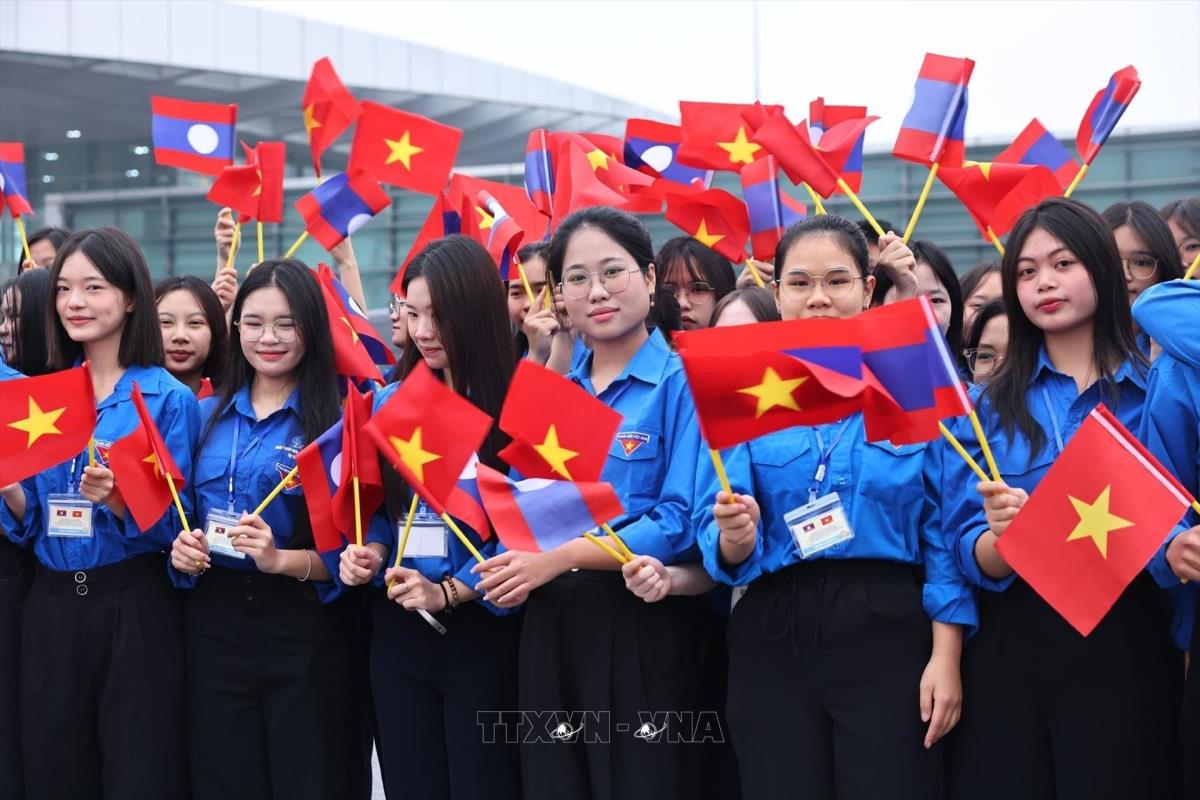 Học sinh, sinh viên thủ đô đón Tổng Bí thư Ban Chấp hành Trung ương Đảng Nhân dân cách mạng Lào, Chủ tịch nước Cộng hòa Dân chủ Nhân dân Lào Thongloun Sisoulith và Phu nhân tại sân bay Quốc tế Nội Bài. Ảnh: Minh Đức – TTXVN