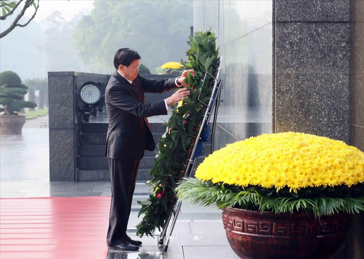 Tổng Bí thư, Chủ tịch nước Lào Thongloun Sisoulith và Phu nhân cùng Đoàn đại biểu cấp cao Đảng, Nhà nước Lào đã đặt vòng hoa tưởng nhớ Chủ tịch Hồ Chí Minh, Anh hùng giải phóng dân tộc, Nhà văn hóa kiệt xuất của Việt Nam.