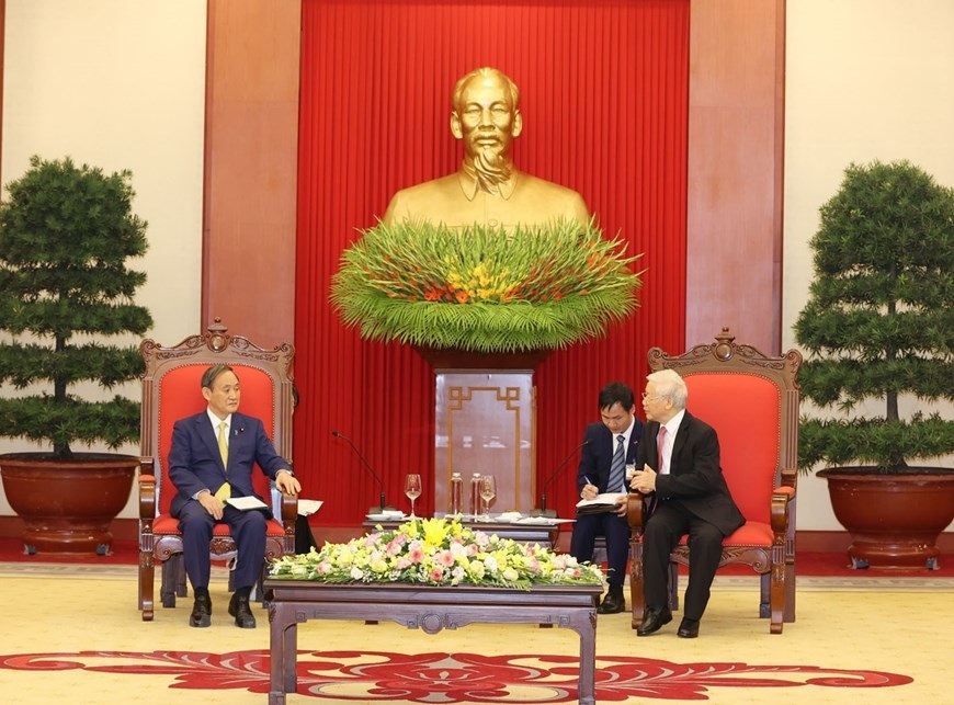 Tổng Bí thư, Chủ tịch nước Nguyễn Phú Trọng tiếp Thủ tướng Nhật Bản Suga Yoshihide. (Ảnh: Trí Dũng/TTXVN)