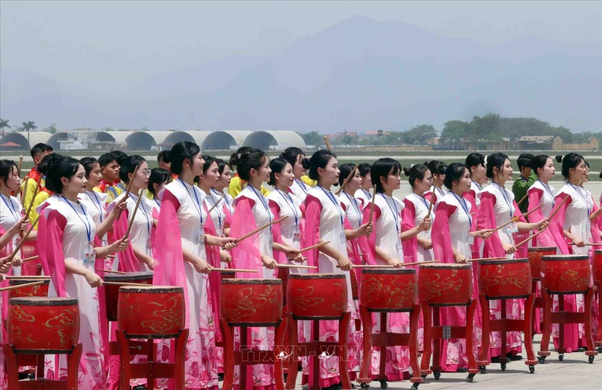 Màn biểu diễn nghệ thuật trống hội tại Lễ đón Tổng Bí thư, Chủ tịch nước Trung Quốc Tập Cận Bình ở Sân bay quốc tế Nội Bài (14/4/2025). Ảnh: Phạm Kiên - TTXVN