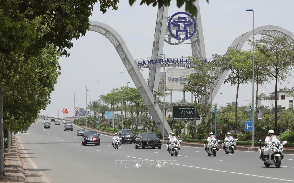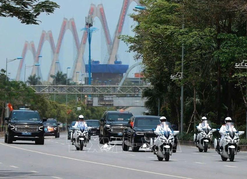 Đoàn xe của Đoàn đại biểu cấp cao Trung Quốc di chuyển từ sân bay quốc tế Nội Bài về trung tâm Thủ đô Hà Nội (14/4/2025). Ảnh: TTXVN