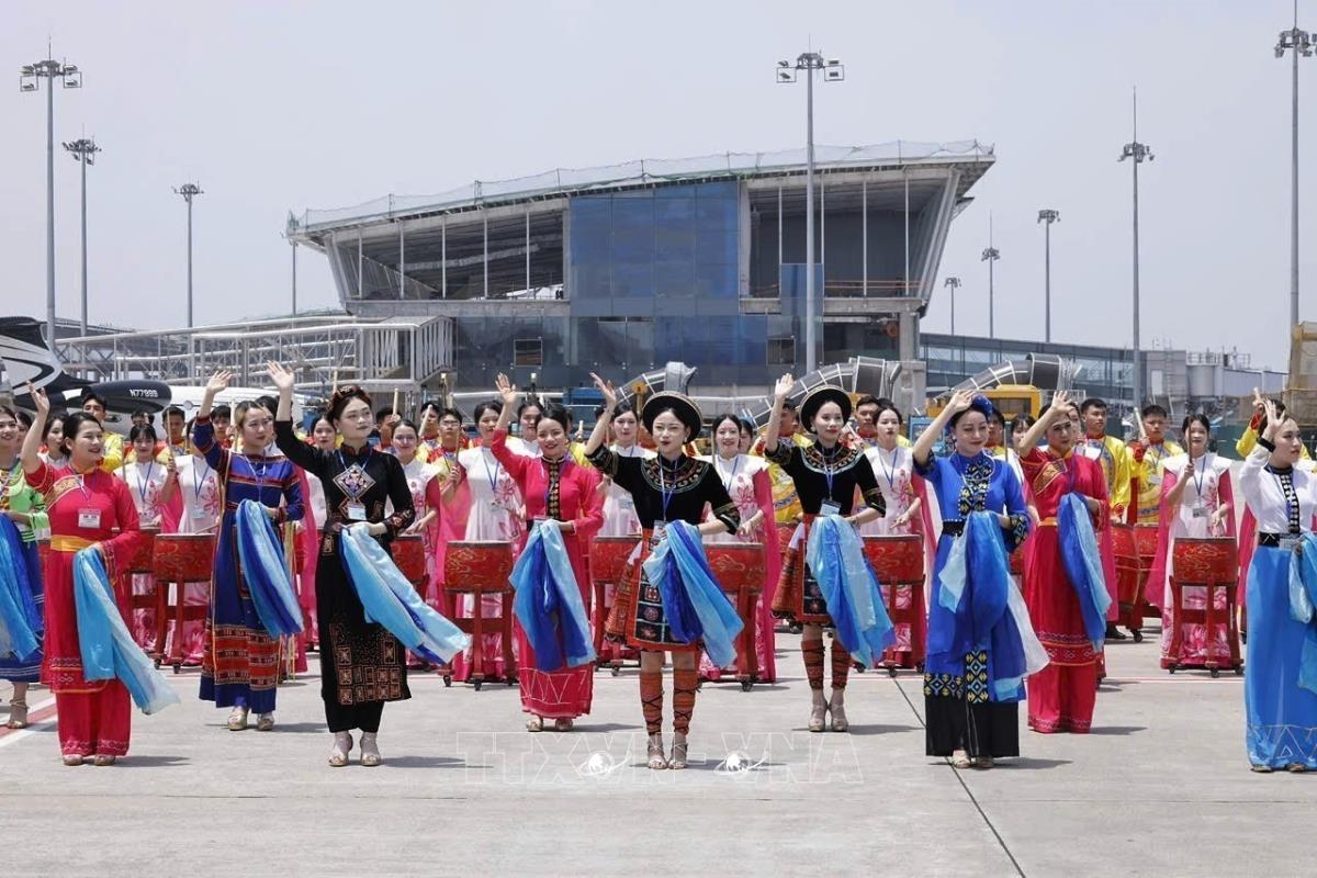 Chương trình biểu diễn văn hóa, nghệ thuật chào mừng tại Lễ đón Tổng Bí thư, Chủ tịch nước Trung Quốc Tập Cận Bình ở Sân bay quốc tế Nội Bài (14/4/2025). Ảnh: TTXVN