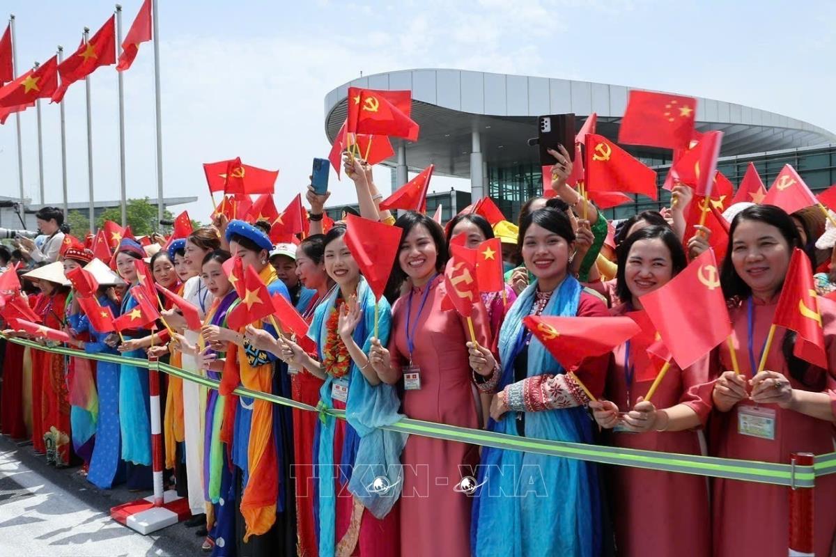 Đại diện các tầng lớp nhân dân Thủ đô Hà Nội đón Tổng Bí thư, Chủ tịch nước Trung Quốc Tập Cận Bình và Đoàn cấp cao Trung Quốc tại Sân bay quốc tế Nội Bài (14/4/2025). Ảnh: TTXVN