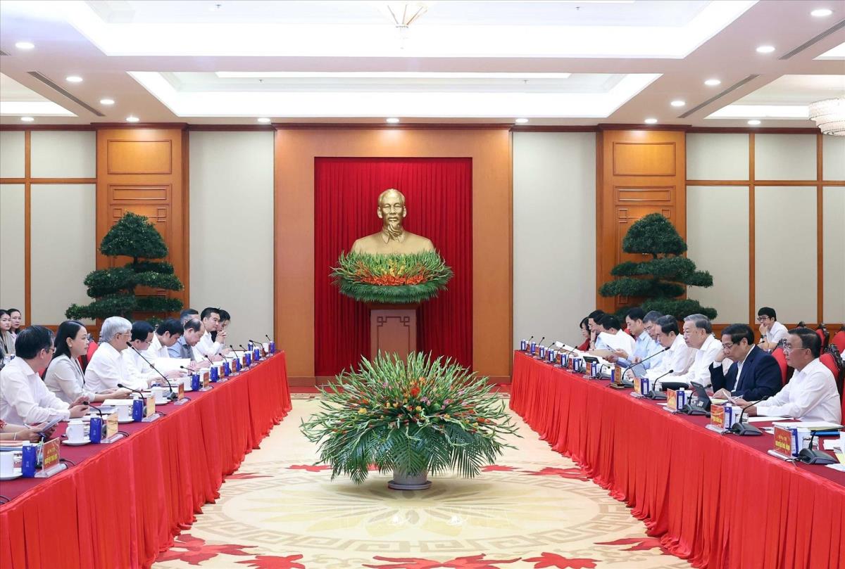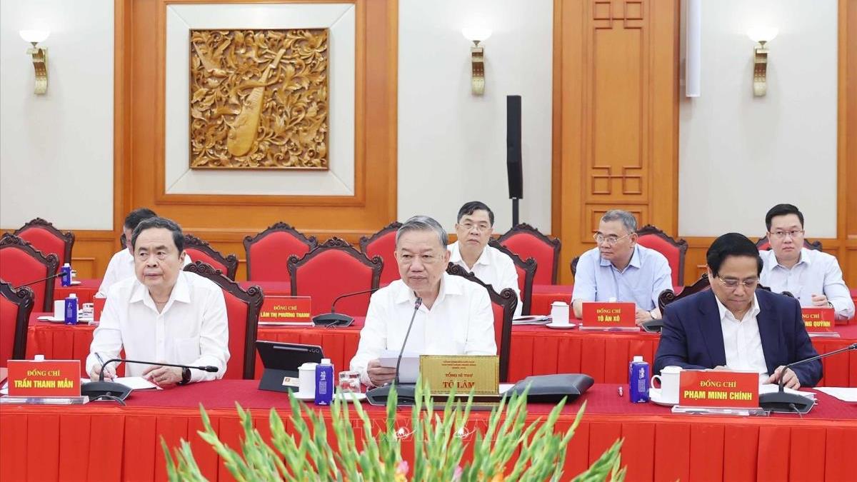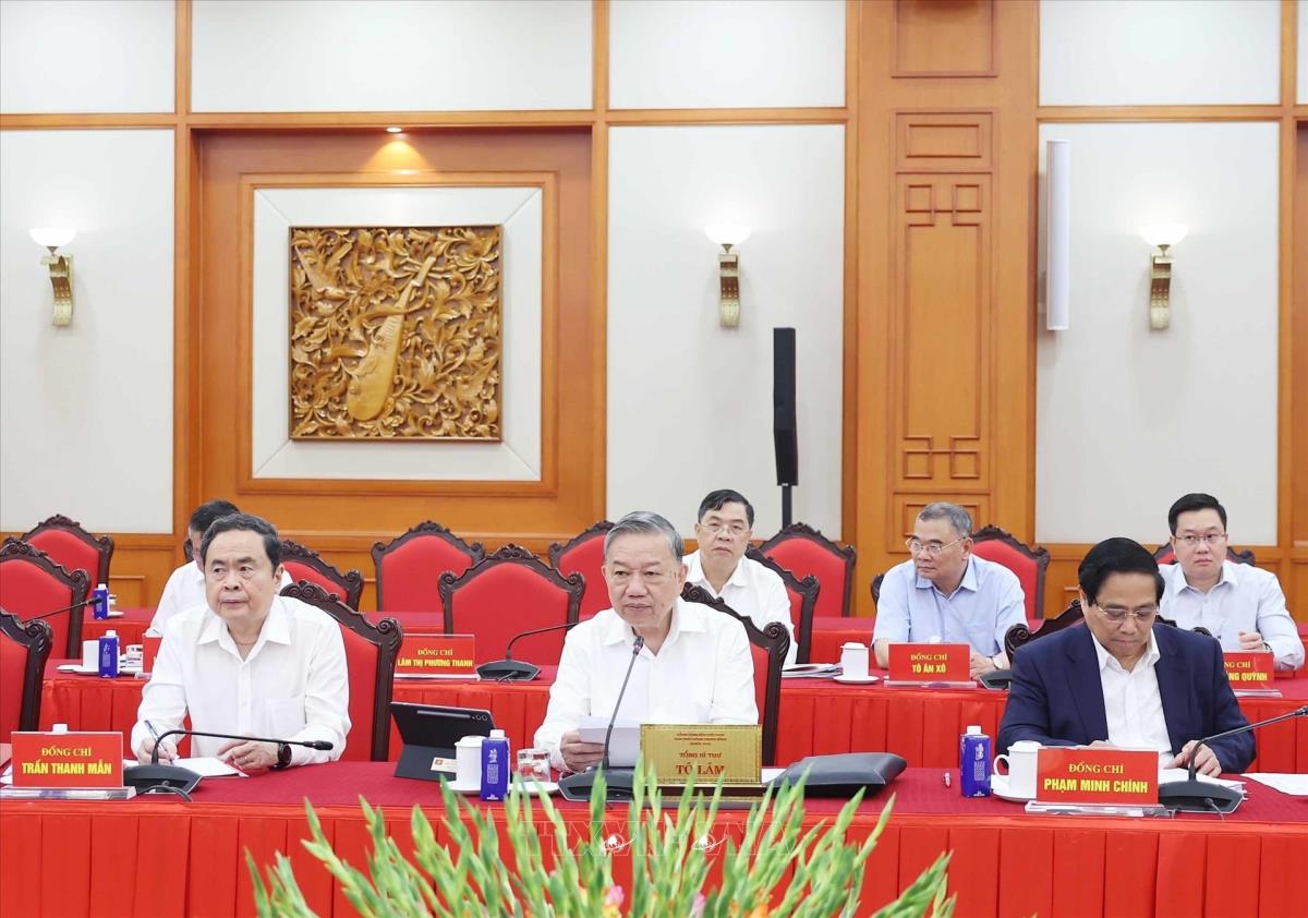 Tổng Bí thư Tô Lâm chủ trì cuộc làm việc của Bộ Chính trị với Ban Thường vụ Đảng uỷ Mặt trận Tổ quốc, các đoàn thể Trung ương (4/9/2025). Ảnh: Thống Nhất - TTXVN