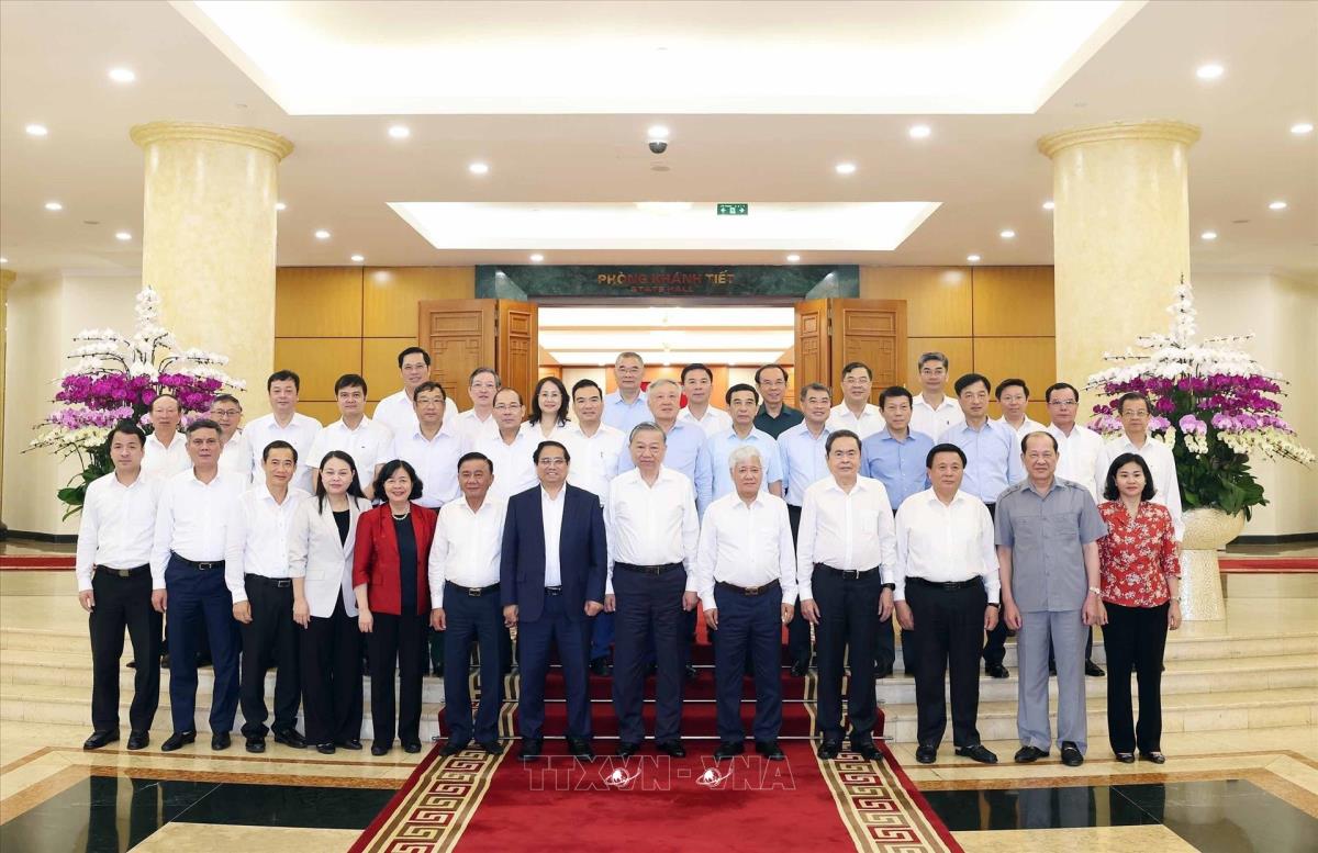 Tổng Bí thư Tô Lâm, các đồng chí trong Bộ Chính trị với Ban Thường vụ Đảng uỷ Mặt trận Tổ quốc Việt Nam, các đoàn thể Trung ương (4/9/2025). Ảnh: Thống Nhất - TTXVN
