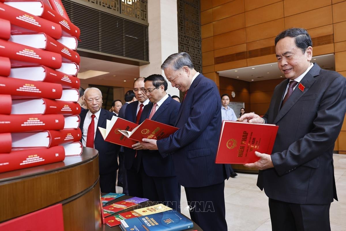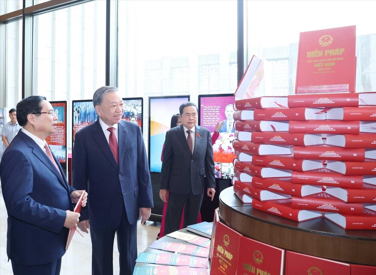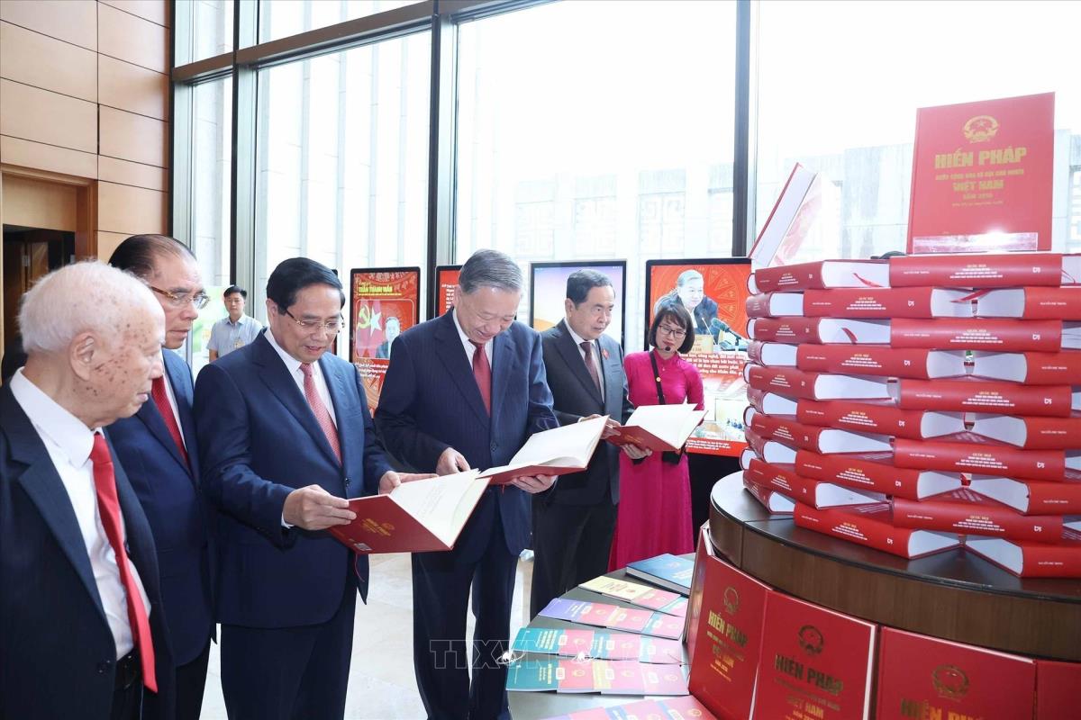Tổng Bí thư Tô Lâm và các đồng chí Lãnh đạo, nguyên Lãnh đạo Đảng, Nhà nước xem trưng bày ấn phẩm Hiến pháp tại Đại hội (25/9/2025). Ảnh: Doãn Tấn-TTXVN