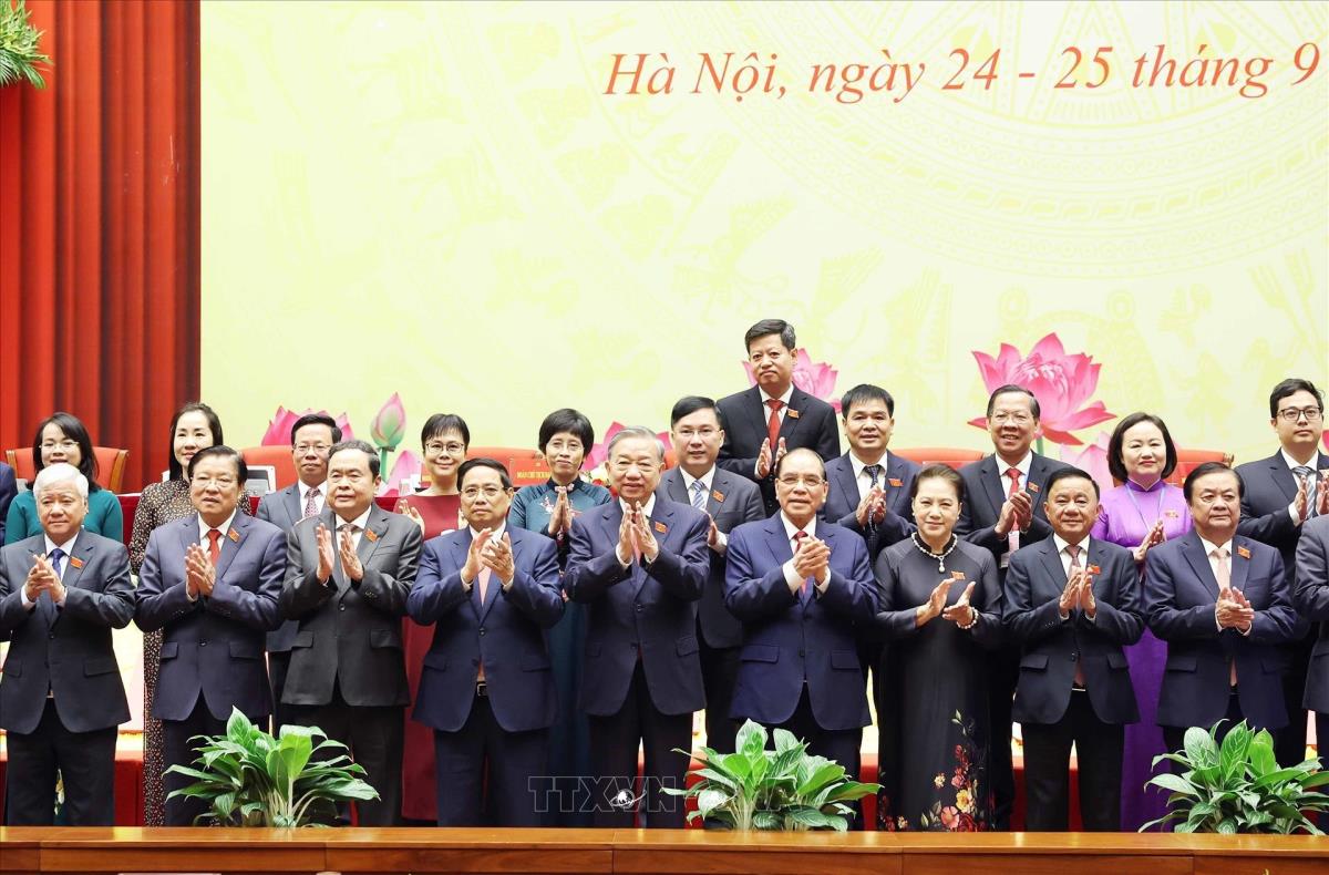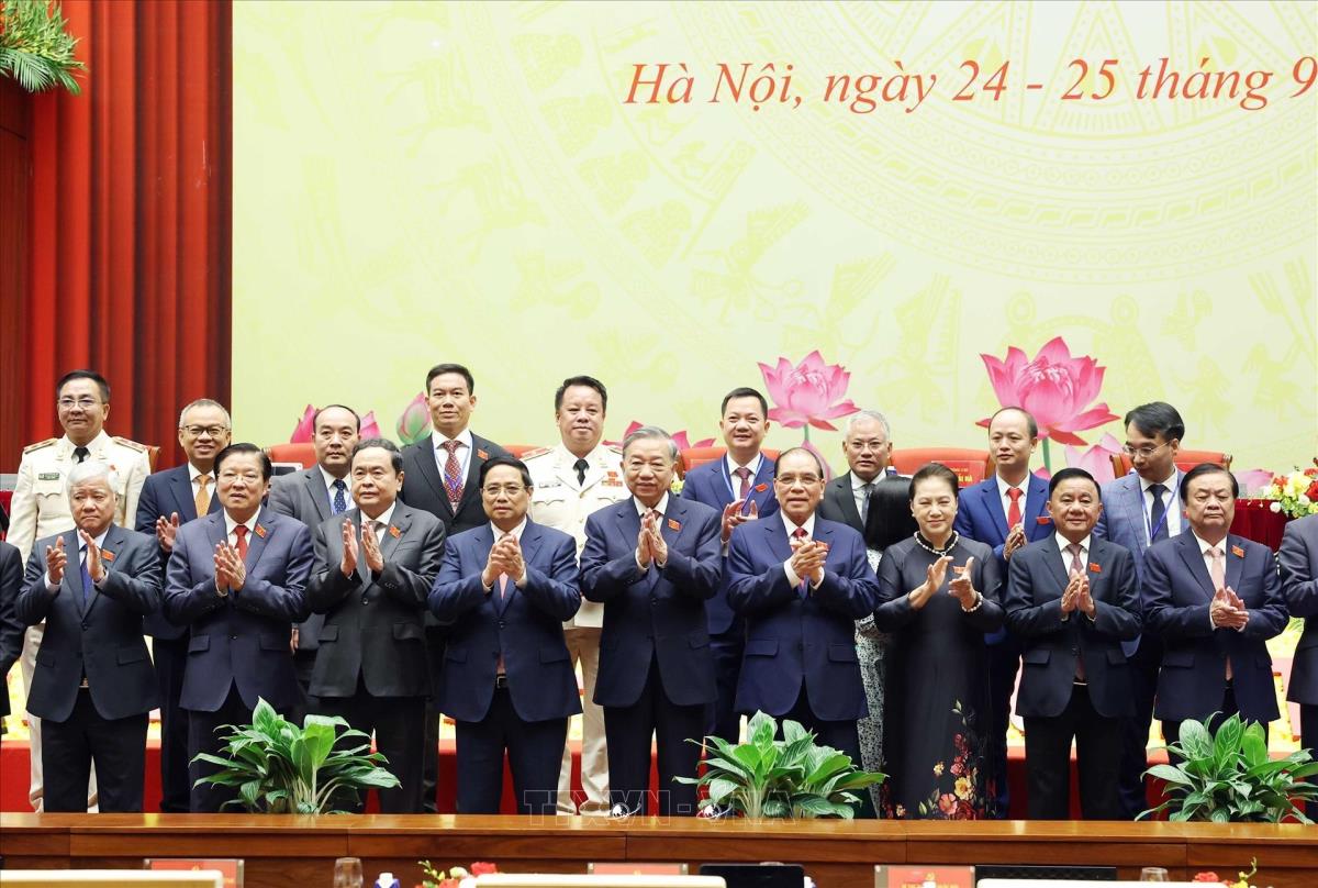 Tổng Bí thư Tô Lâm và các đồng chí Lãnh đạo, nguyên Lãnh đạo Đảng, Nhà nước chụp ảnh chung với các đại biểu (25/9/2025). Ảnh: Thống Nhất - TTXVN