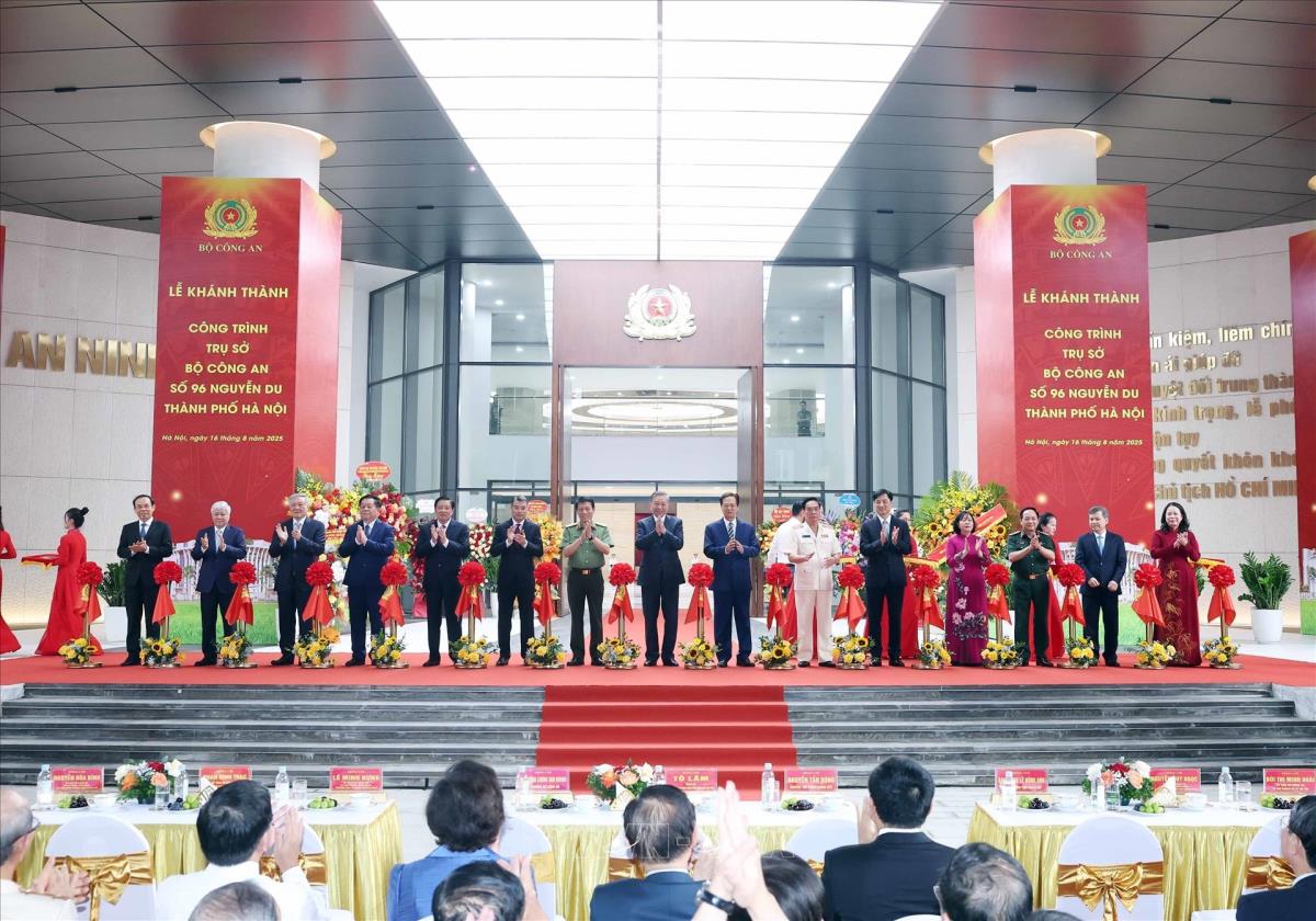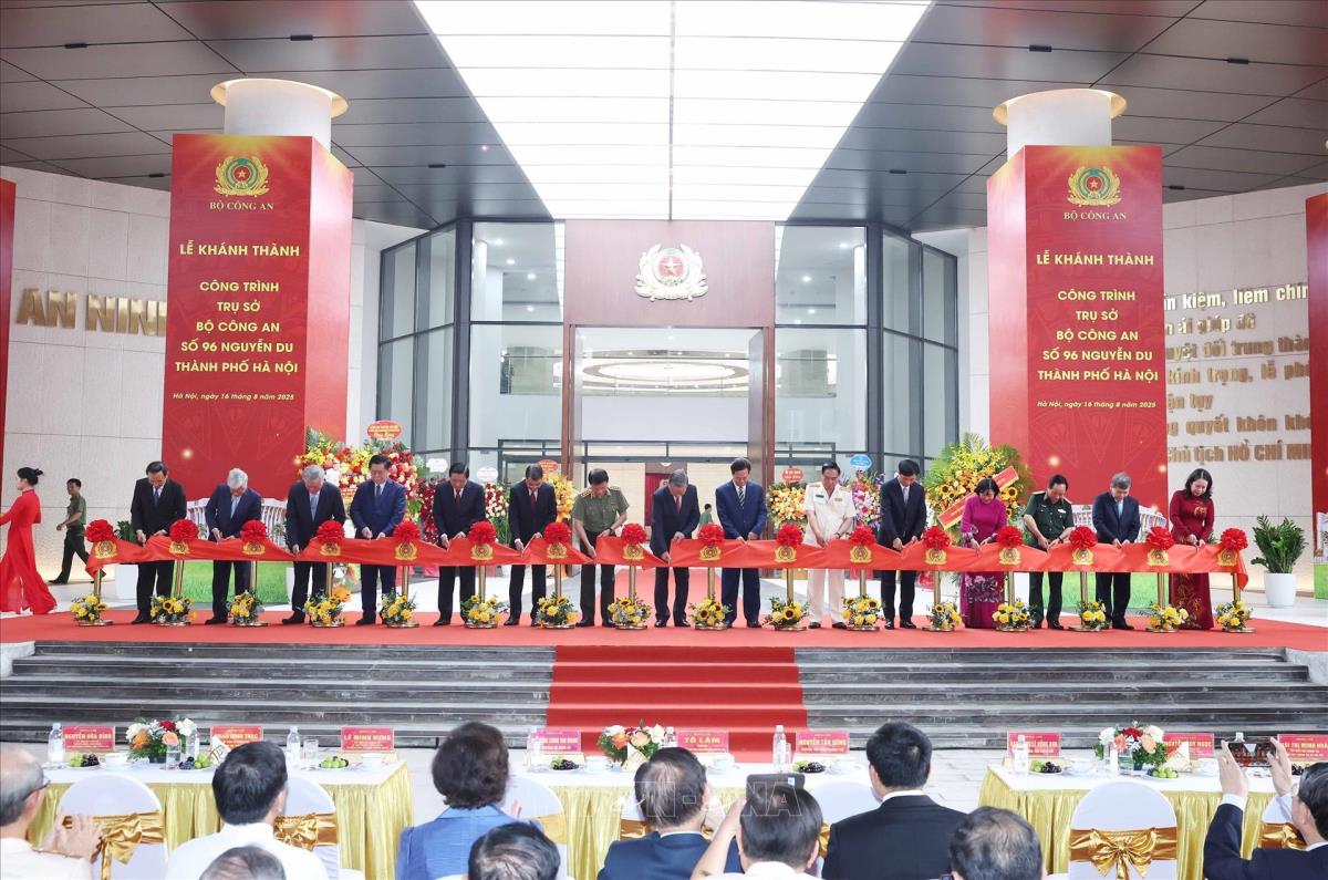 Tổng Bí thư Tô Lâm cùng các đại biểu thực hiện nghi thức cắt băng khánh thành Trụ sở Bộ Công an tại số 96 Nguyễn Du, thành phố Hà Nội (16/8/2025). Ảnh: Phạm Kiên - TTXVN