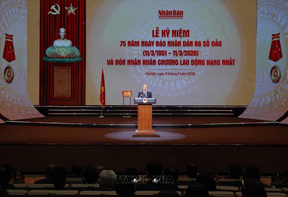 Hà Nội (TTXVN 11/3/2026) Sáng 11/3/2026, tại Hà Nội, Tổng Bí thư Tô Lâm dự Lễ kỷ niệm 75 năm Ngày Báo Nhân Dân ra số đầu tiên (11/3/1951 - 11/3/2026) và đón nhận Huân chương Lao động hạng Nhất.