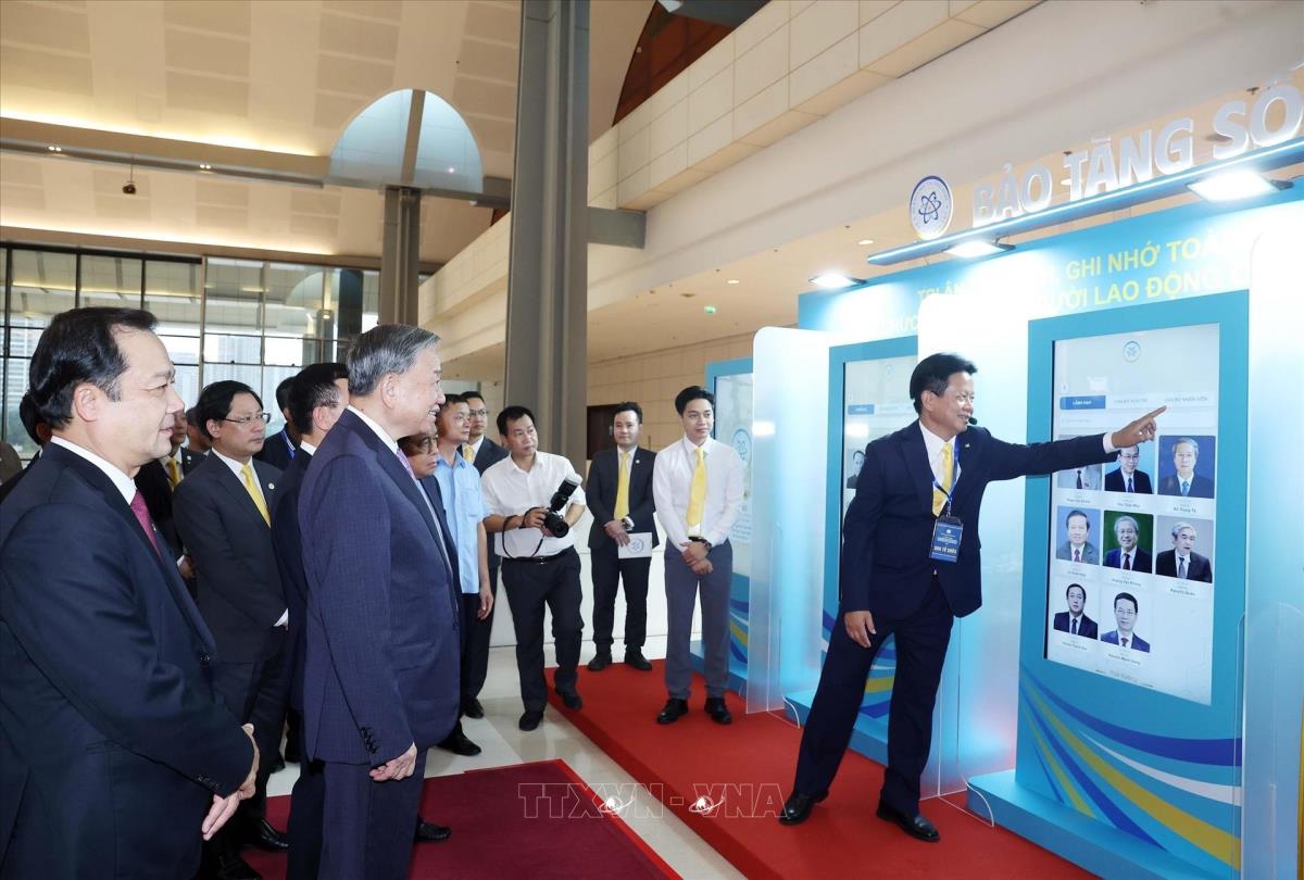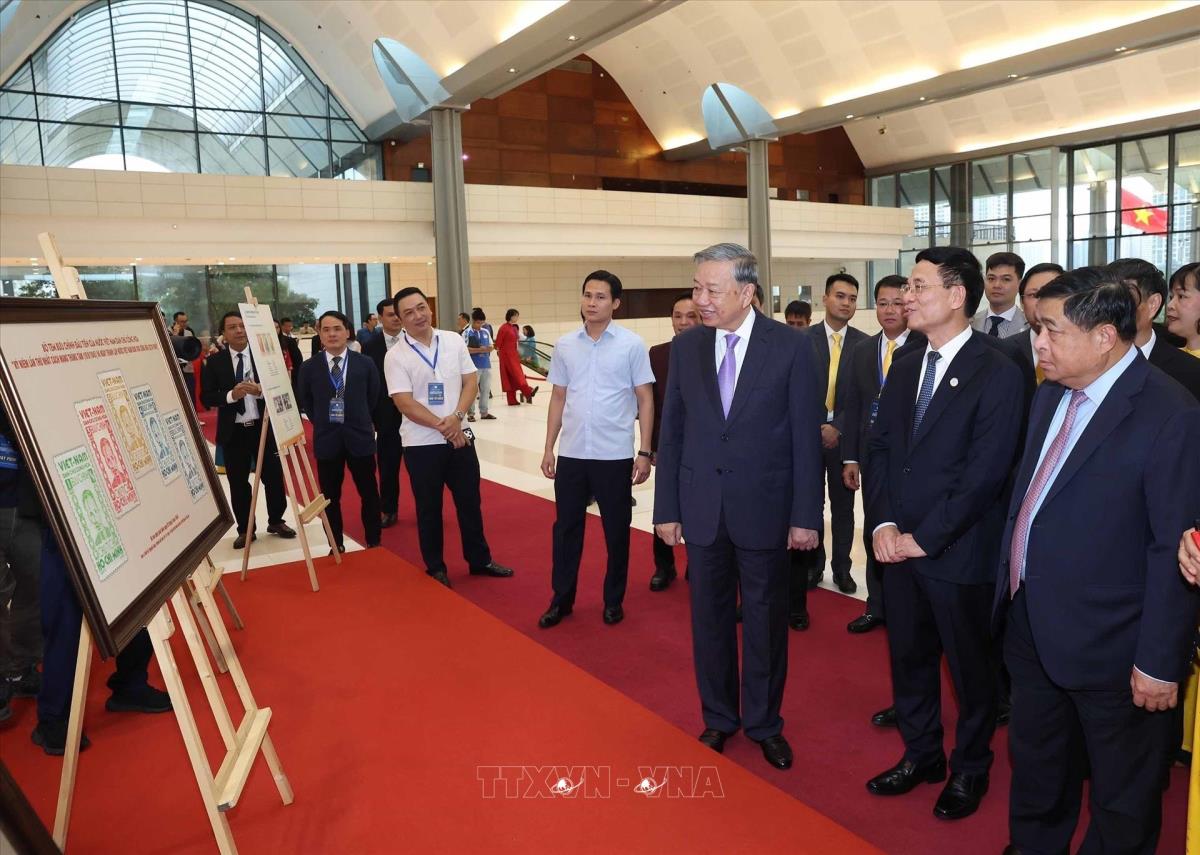 Tổng Bí thư Tô Lâm cùng các đại biểu tham quan triển lãm về quá trình hình thành và phát triển của ngành Bưu chính và Viễn thông. Ảnh: Thống Nhất - TTXVN